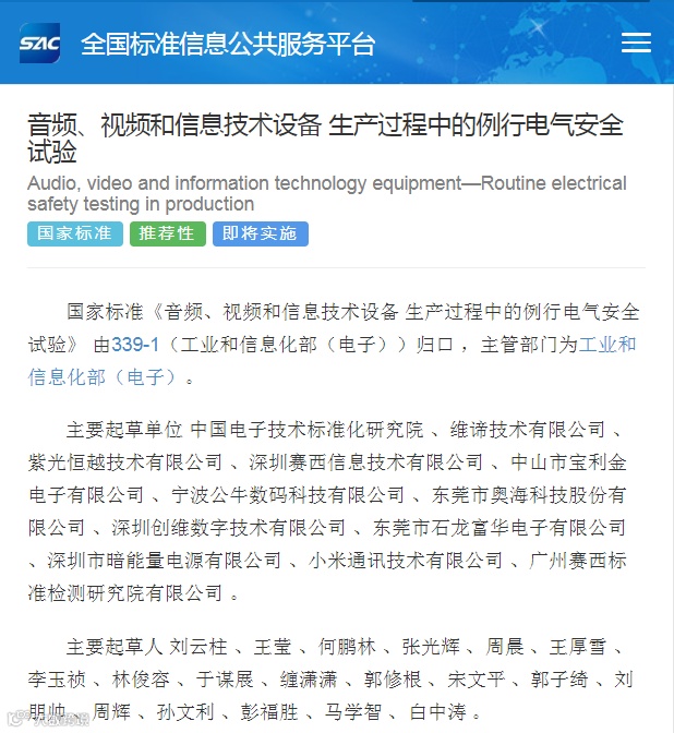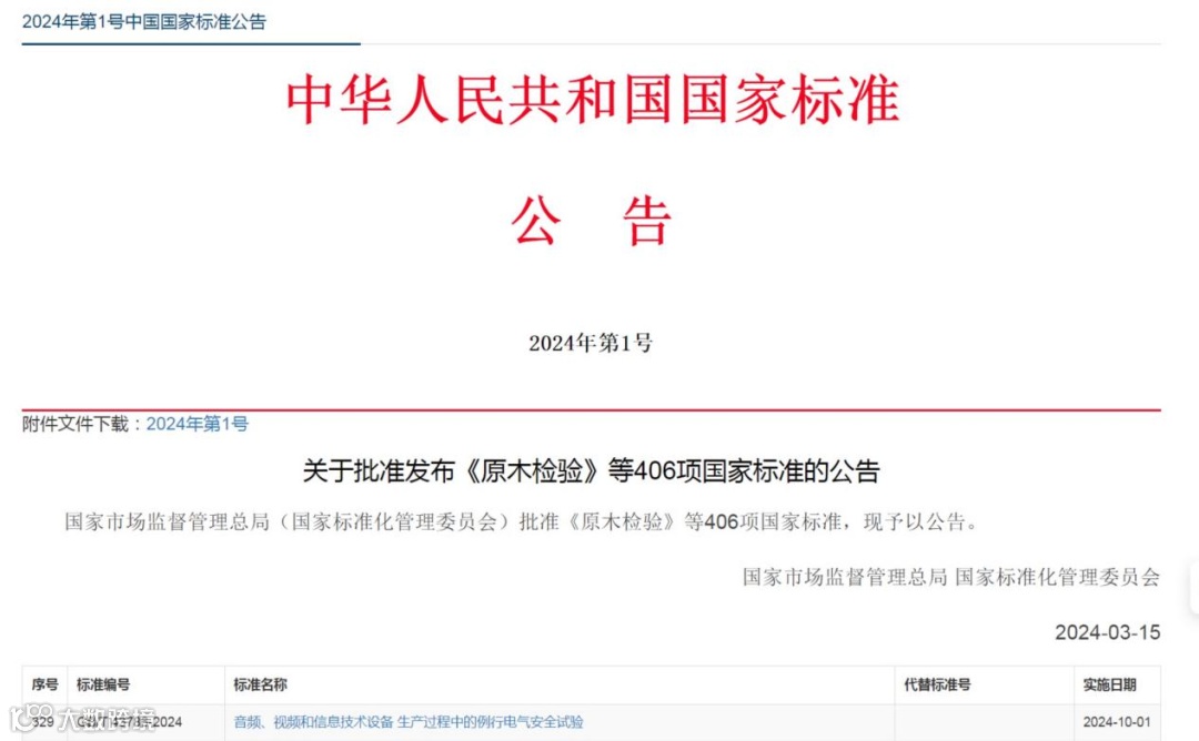 根据2024年3月15日中华人民共和国国家标准公告《关于批准发布《原木检验》等406项国家标准的公告》[2024年第1号],推荐性国家标准GB/T 43786-2024《音频、视频和信息技术设备 生产过程中的例行电气安全试验》正式发布,该标准由工业和信息化部(电子)归口,中国电子技术标准化研究院(赛西,CESI)作为第1起草单位参与了该标准的制定工作,将于2024年10月1日起正式实施。