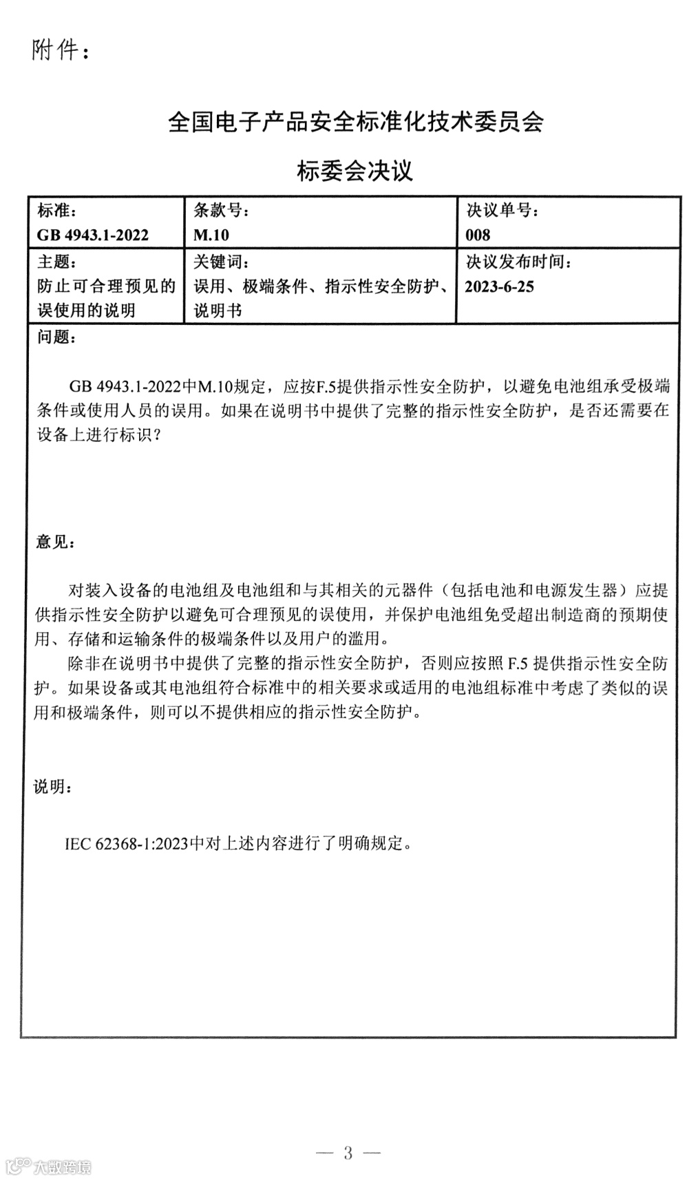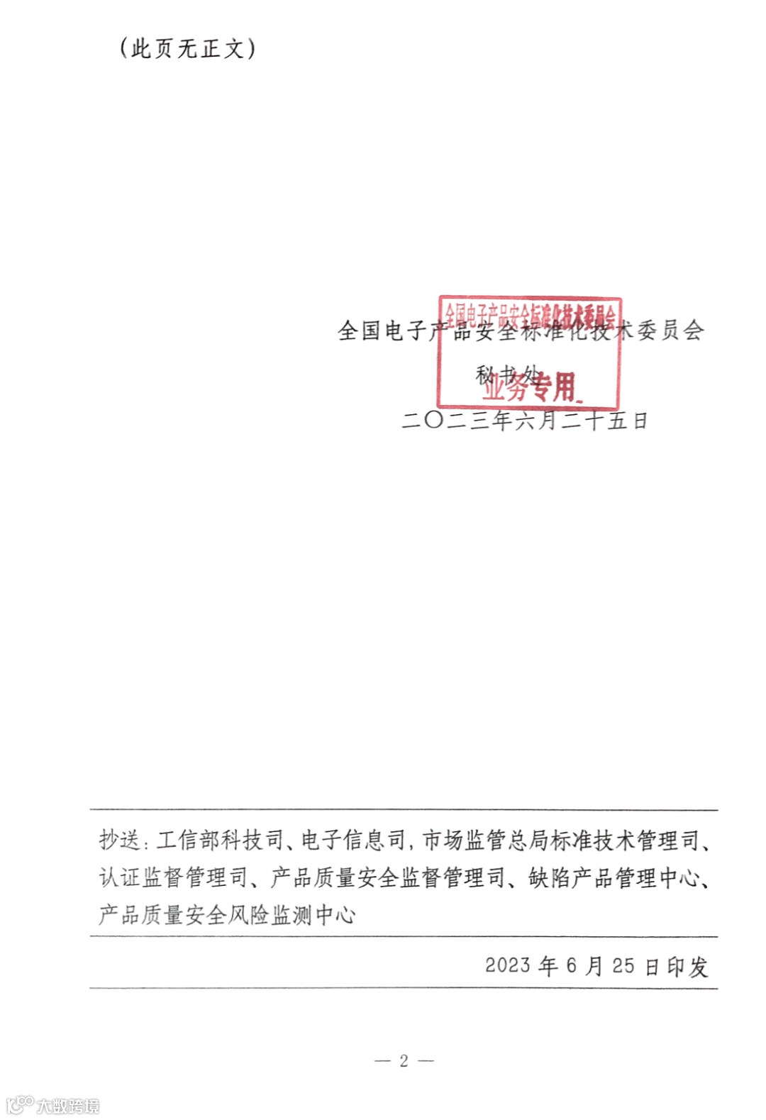 经SAC/TC588全国电子产品安全标准化技术委员会技术专家组讨论和投票表决,标委会第008号决议已于2023年6月25日正式发布,决议内容如下: