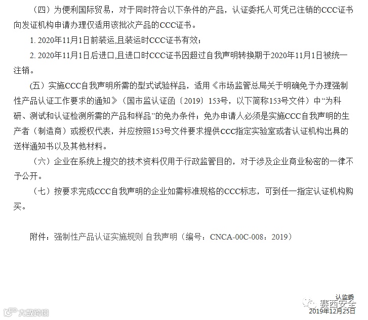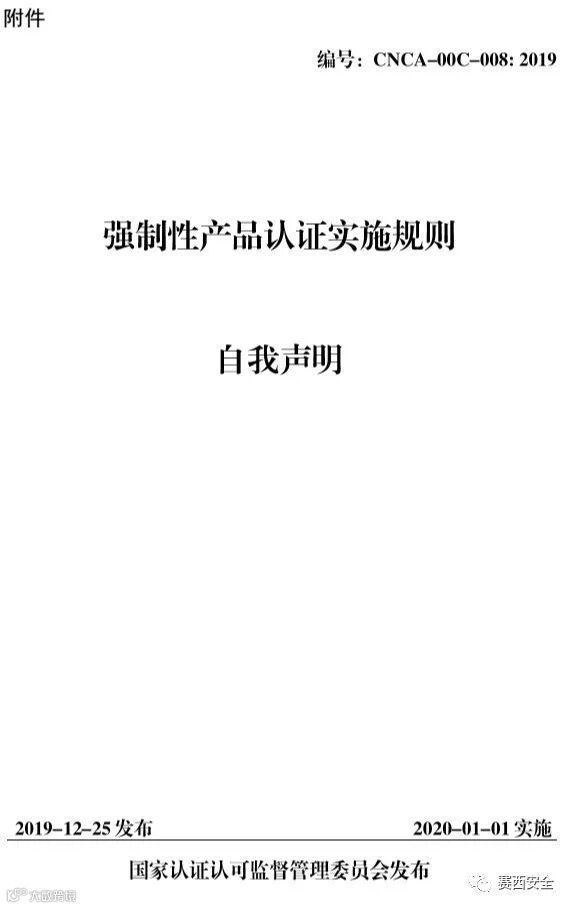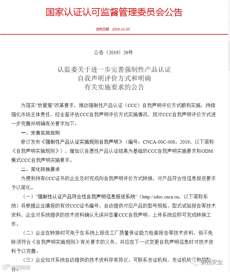 为落实“放管服”改革要求,推动强制性产品认证(CCC)自我声明评价方式顺利实施,持续强化市场主体责任,国家认监委近日发布《关于进一步完善强制性产品认证自我声明评价方式和明确有关实施要求》的公告。并修订发布《强制性产品认证实施规则自我声明》(编号:CNCA-00C-008:2019),该规则已于2020年1月1日起正式实施。