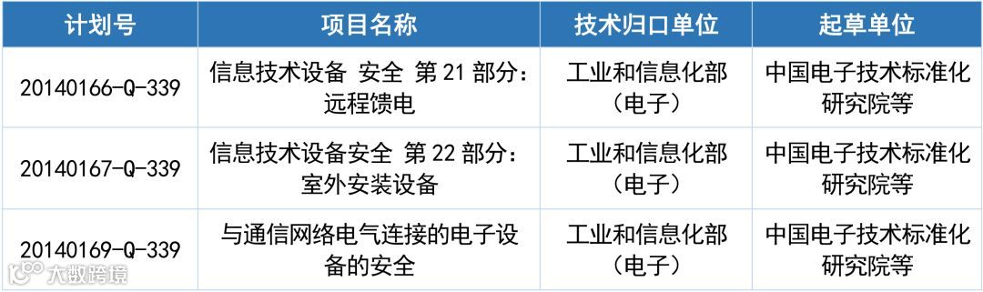 据悉,由中国电子技术标准化研究院(赛西,CESI)主导制定的3项国家强制性标准GB XXXX《信息技术设备 安全 第21部分:远程馈电》(计划号:20140166-Q-339)、GB XXXX《信息技术设备 安全 第22部分:室外安装设备》(计划号:20140167-Q-339)、GB XXXX《与通信网络电气连接的电子设备的安全》(计划号:20140169-Q-339)已由工业和信息化部报送至国家标准化管理委员会,即将发布。