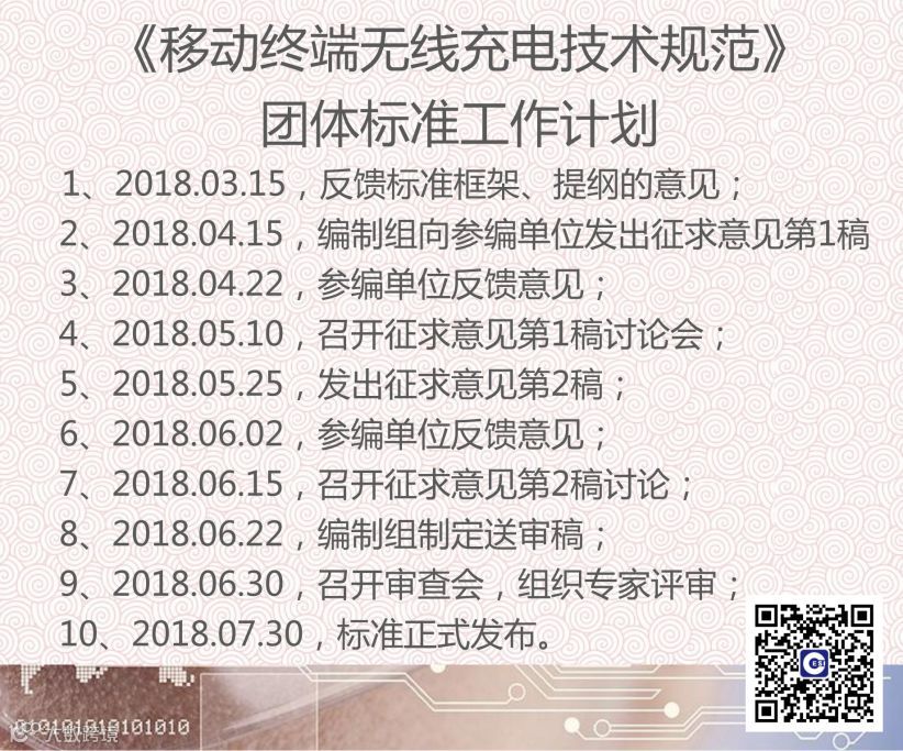 2018年3月7日,中国通信工业协会团体标准《移动终端无线充电技术规范》编制工作组第一次会议在中国电子技术标准化研究院召开,该标准由中国电子技术标准化研究院(赛西,CESI)牵头制定。来自电小二、华为、东莞新能源(ATL)、易冲无线、威凯等31家致力于配件、手机、电池、芯片、检测领域的64位代表参加了此次会议,国家质检总局缺陷产品管理中心、中国民航危险品运输管理中心领导出席了此次会议并进行了讲话。