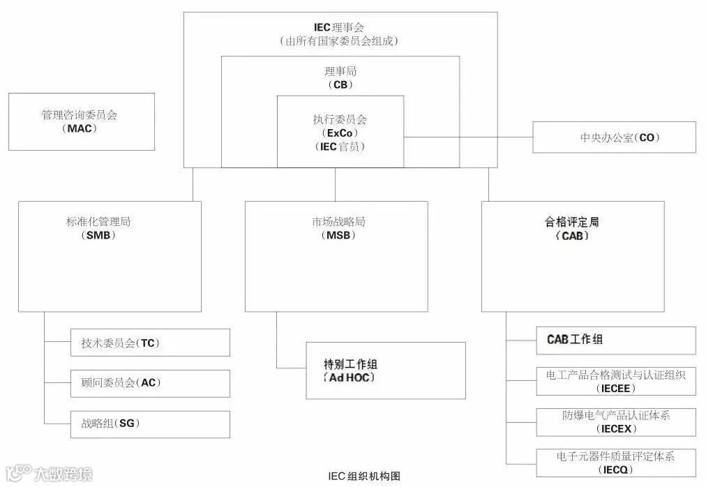 根据IEC章程和议事规则的规定,IEC的主要机构有理事会(全体大会)、理事局、执行委员会、管理咨询委员会、标准化管理局、合格评定局、市场战略局、中央办公室等。