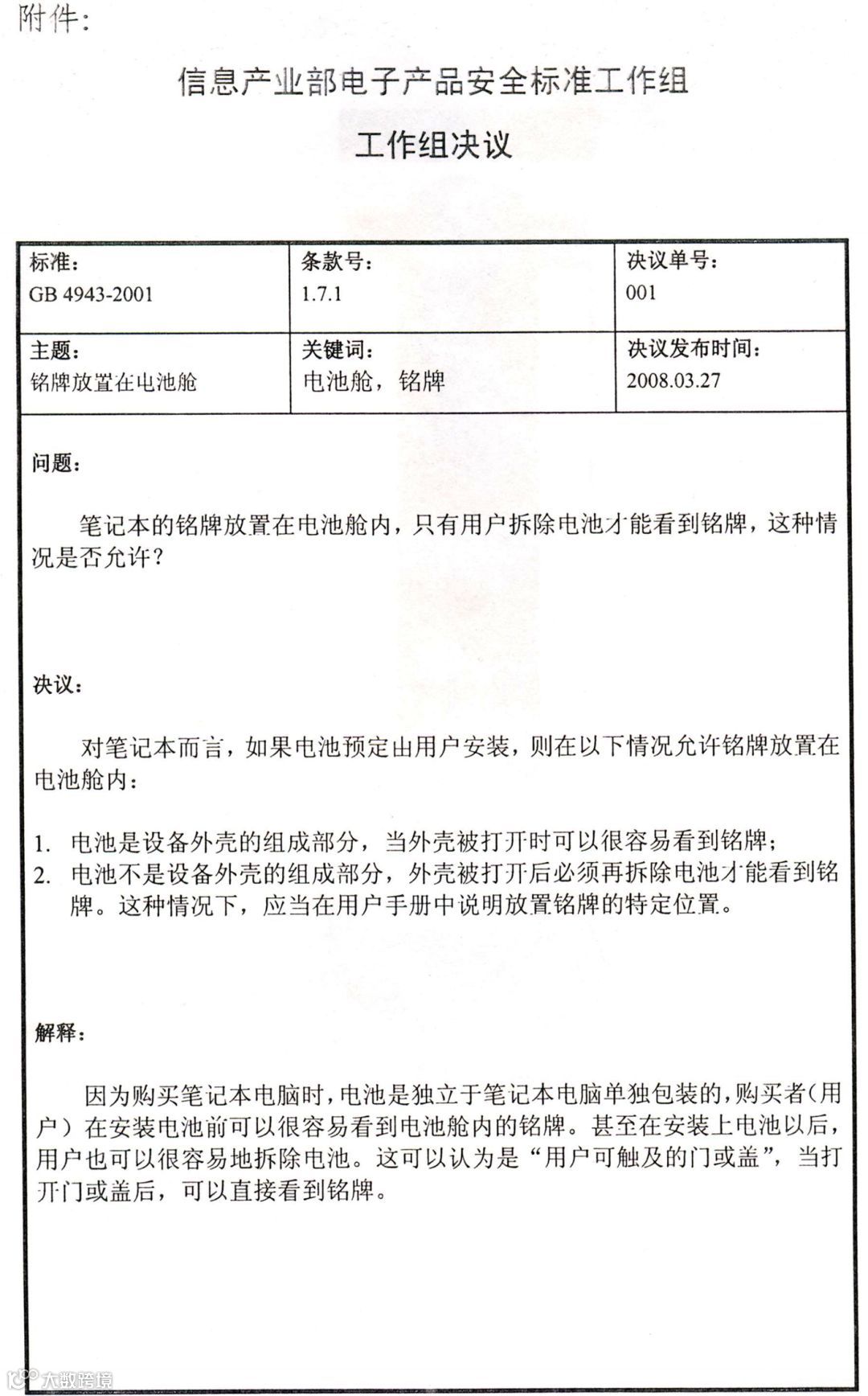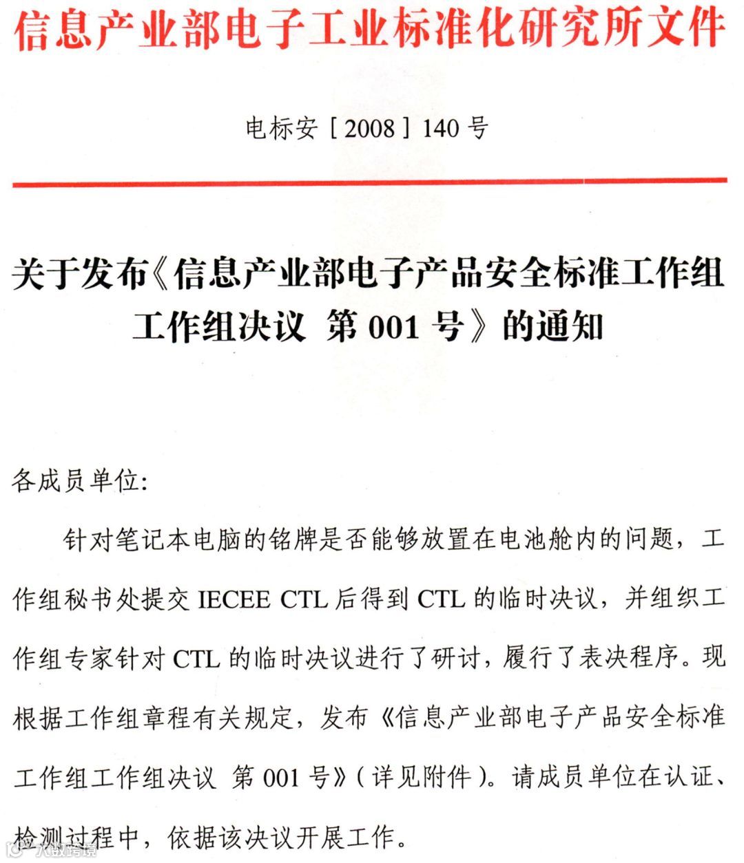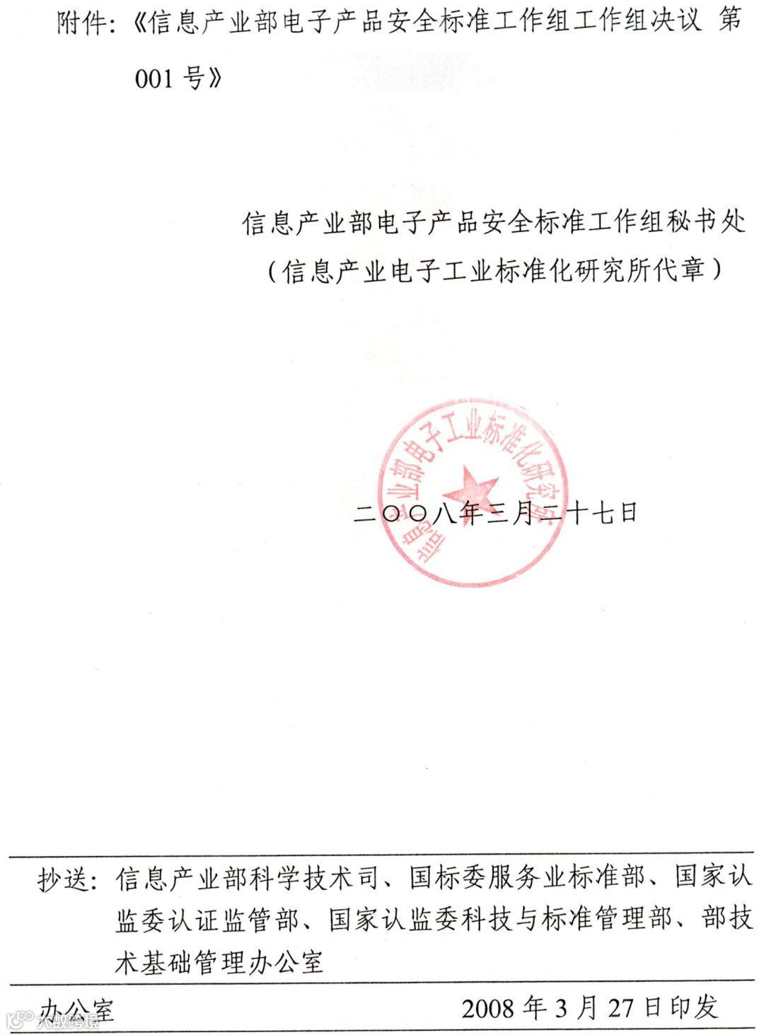 经工信部电子产品安全标准工作组专家讨论和投票表决,001号决议已于2008年3月27日正式发布,其修改件于2009年2月18日正式发布,现再次公布如下: