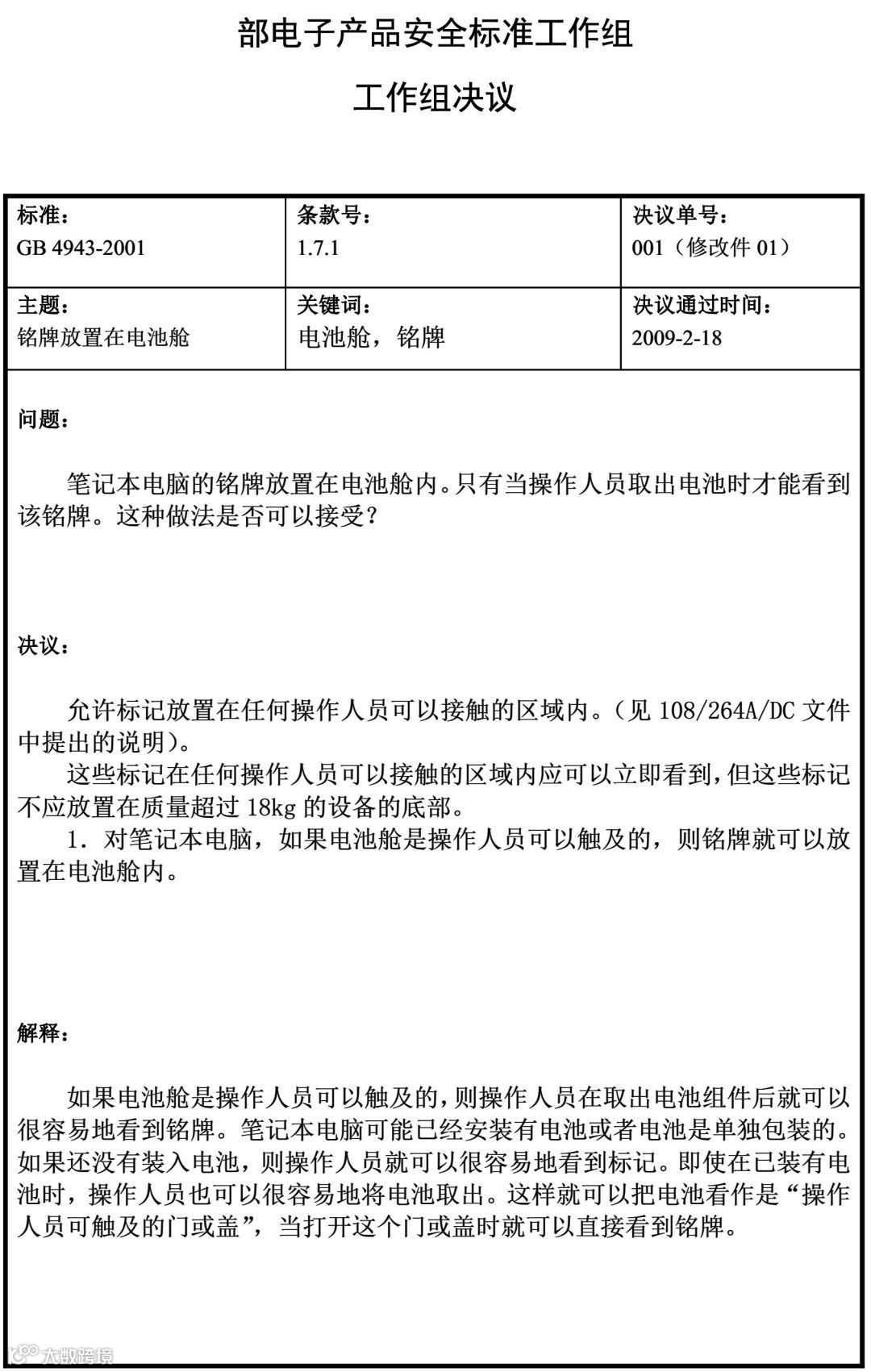 ■第001号决议:GB 4943-2001第1.7.1条“铭牌放置在电池舱”