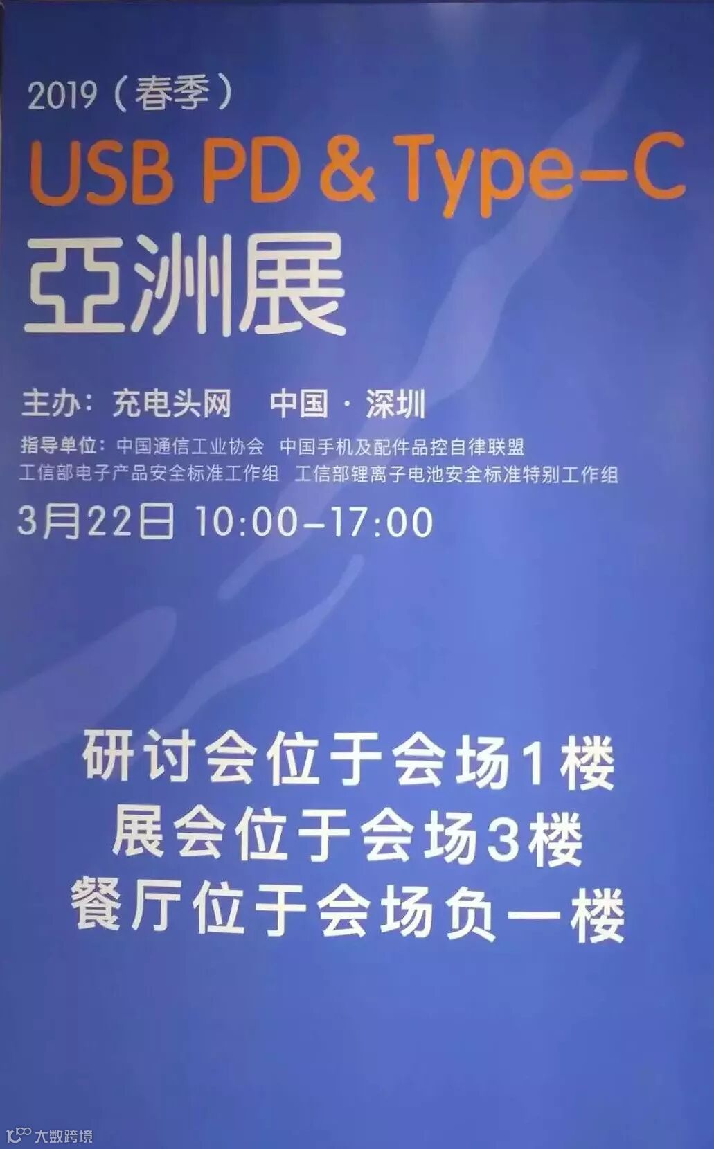 2019年3月22日,2019(春季) USB PD&Type-C亚洲展在深圳市南山区科兴科学园隆重召开。论坛展会由充电头网主办,工信部电子产品安全标准工作组、工信部锂离子电池安全标准特别工作组(秘书处单位为中国电子技术标准化研究院,赛西,CESI)是该论坛展会的指导单位组织。