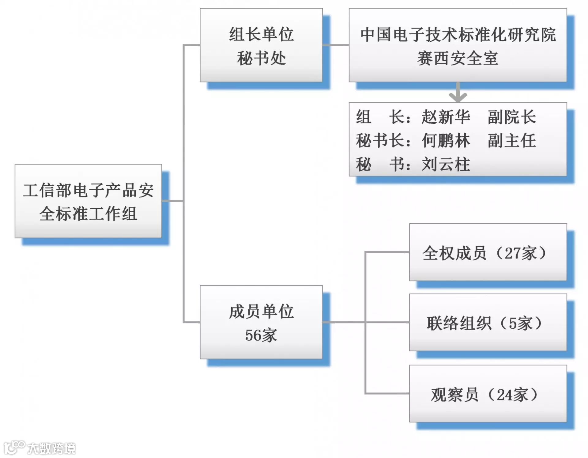 工信部电子产品安全标准工作组(以下简称:安全工作组)成立于2004年,是工信部主管的标准化组织,主要负责开展音视频设备、信息技术设备、通信技术设备以及与相关元器件、测试方法的安全标准的研究与制修订工作,在国际上主要对口IEC/TC108“音频、视频、信息技术和通信技术领域内电子产品安全技术委员会”。