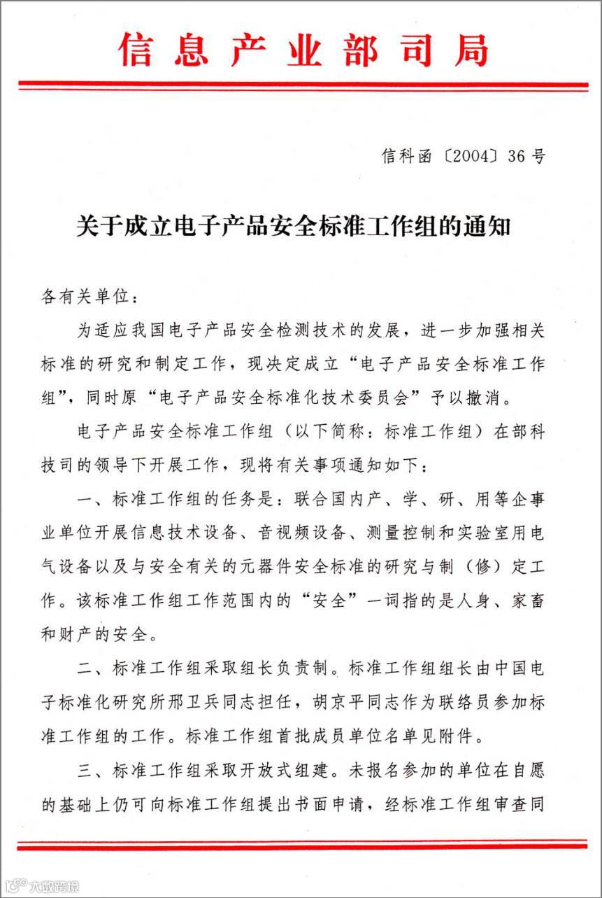 为适应我国电子产品安全检测技术的发展,进一步加强相关标准的研究和制定工作,原信息产业部批准成立了“电子产品安全标准工作组”(信科函[2004]36号),安全工作组组长单位和秘书处均为中国电子技术标准化院(CESI,赛西)。