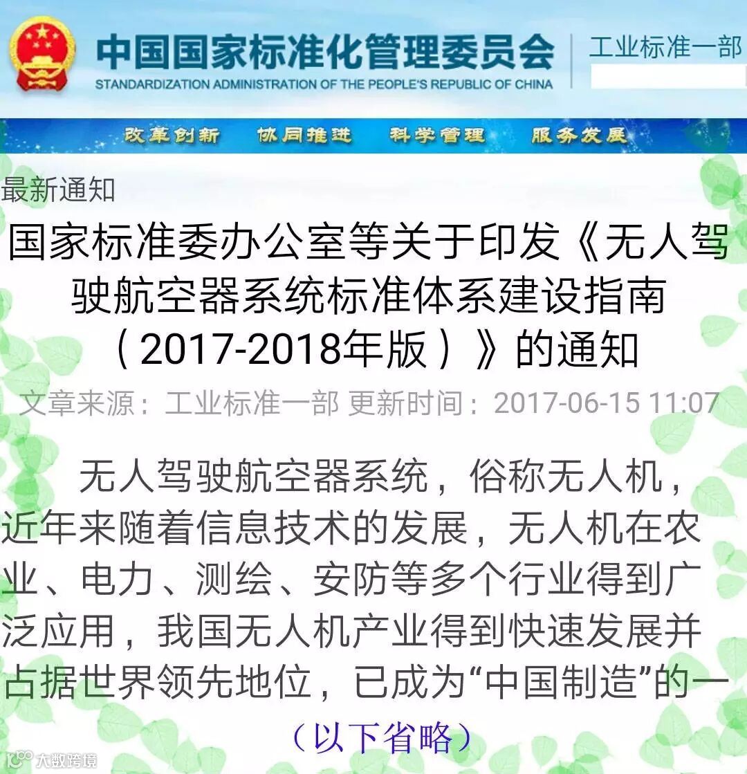 为落实《中国制造2025》(国发[2015]28号)、《关于促进通用航空业发展的指导意见》(国办发[2016]38号)和《装备制造业标准化和质量提升规划》(国质检标联[2016]396号)战略部署,加快推进无人驾驶航空器系统产业发展,切实发挥标准的引领和支撑作用,指导无人驾驶航空器系统标准化工作的开展,国家标准化管理委员会、科学技术部、工业和信息化部、公安部、农业部、国家体育总局、国家能源局、中国民用航空局共同组织制定了《无人驾驶航空器系统标准体系建设指南(2017-2018年版)》。