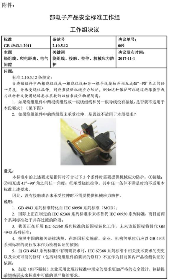 截至发文日(2017年11月14日),工作组共发布工作组决议9项,与GB 4943.1-2011《信息技术设备 安全 第1部分:通用要求》和GB 8898-2011《音频、视频及类似电子设备 安全要求》及其上一版本相关,部分决议已在本公众号发布,详见文末链接,剩余决议将陆续在本公众号发布。