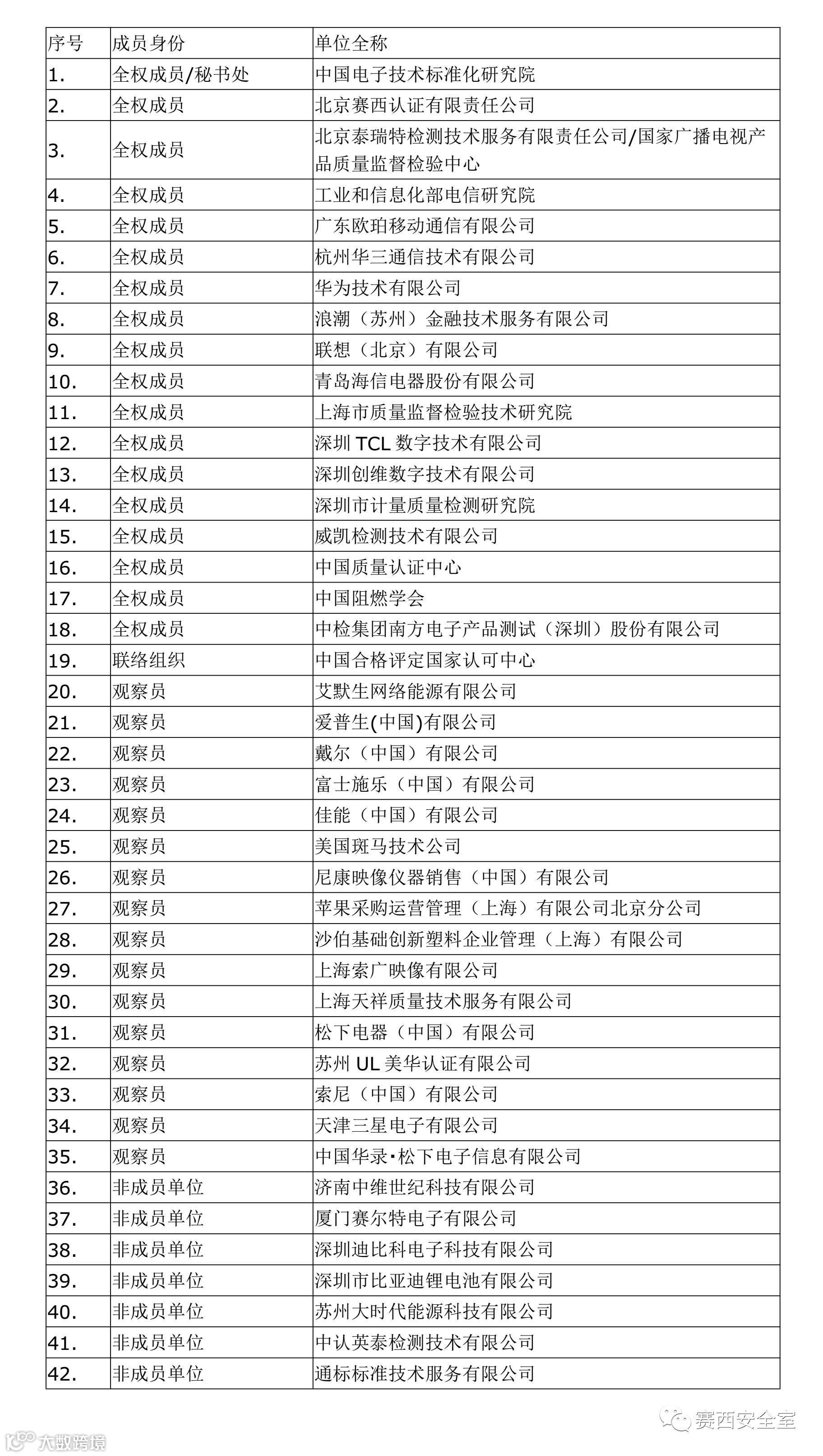 部电子产品安全标准工作组秘书处(以下简称“秘书处”)于2017年1月3日公布了立项标准具体情况,详见“赛西安全室”(CESI_Safety)微信公众号当日信息“电子产品安全认证配套标准”。2017年1月5日,秘书处按照《部电子产品安全标准工作组章程》规定设立项目组,并向工作组成员单位征集项目组成员。下面将项目组成员征集情况公示如下: