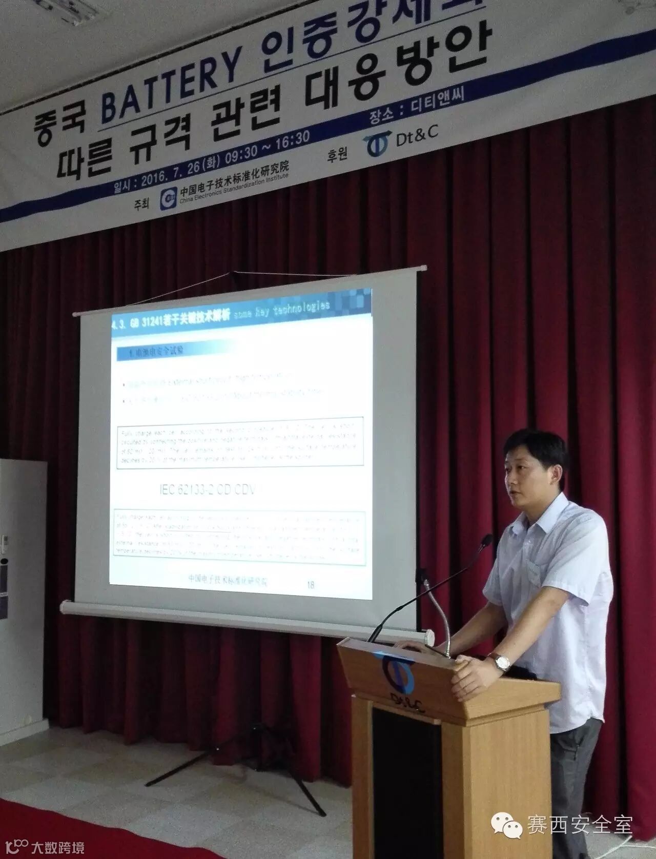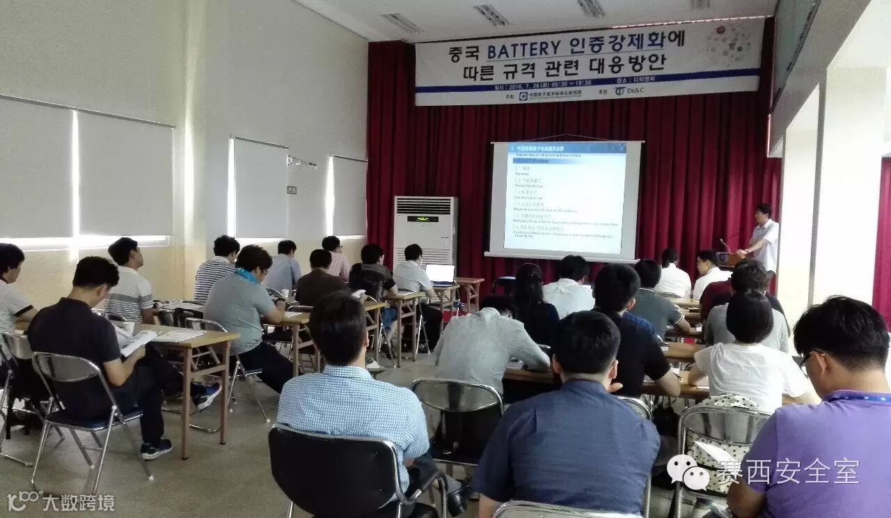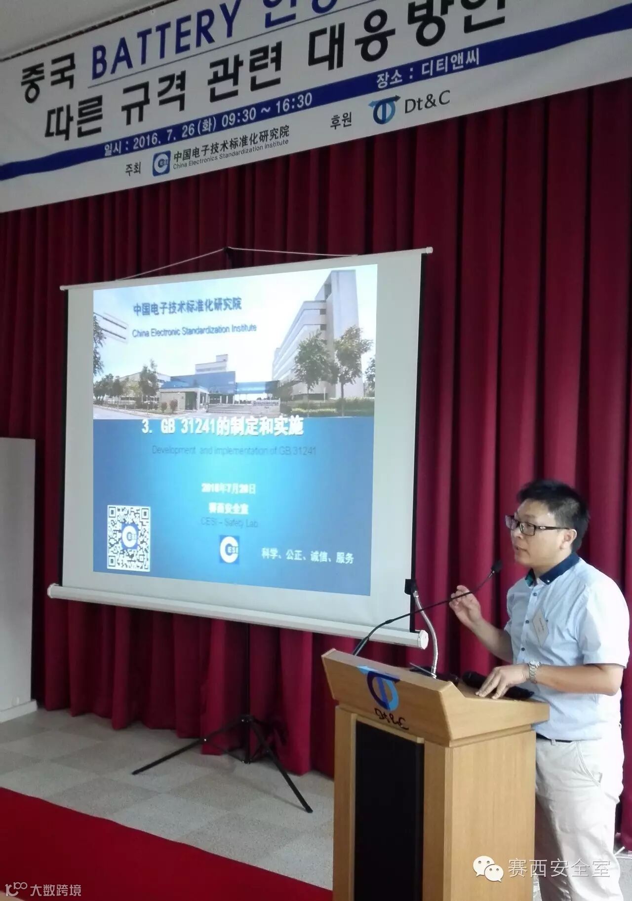2016年7月26日,中国电子技术标准化研究院(赛西,CESI)安全室在韩国京畿道龙仁市举办GB 31241-2014《便携式电子产品用锂离子电池和电池组 安全要求》宣贯会。来自韩国电池制造企业(LG化学、三星SDI、SK等)以及电子产品整机企业(LG电子、三星电子、现代摩比斯、Green Power等)的30多位代表参加了本次宣贯会。