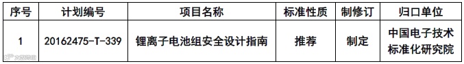 根据国家标准化管理委员会于2016年12月13日印发的《国家标准委关于下达2016年第四批国家标准制修订计划的通知》(国标委综合〔2016〕89号),由中国电子技术标准化研究院(赛西,CESI)归口管理并组织起草的国家标准GB/T ××××《锂离子电池组安全设计指南》已经正式立项并启动起草工作。