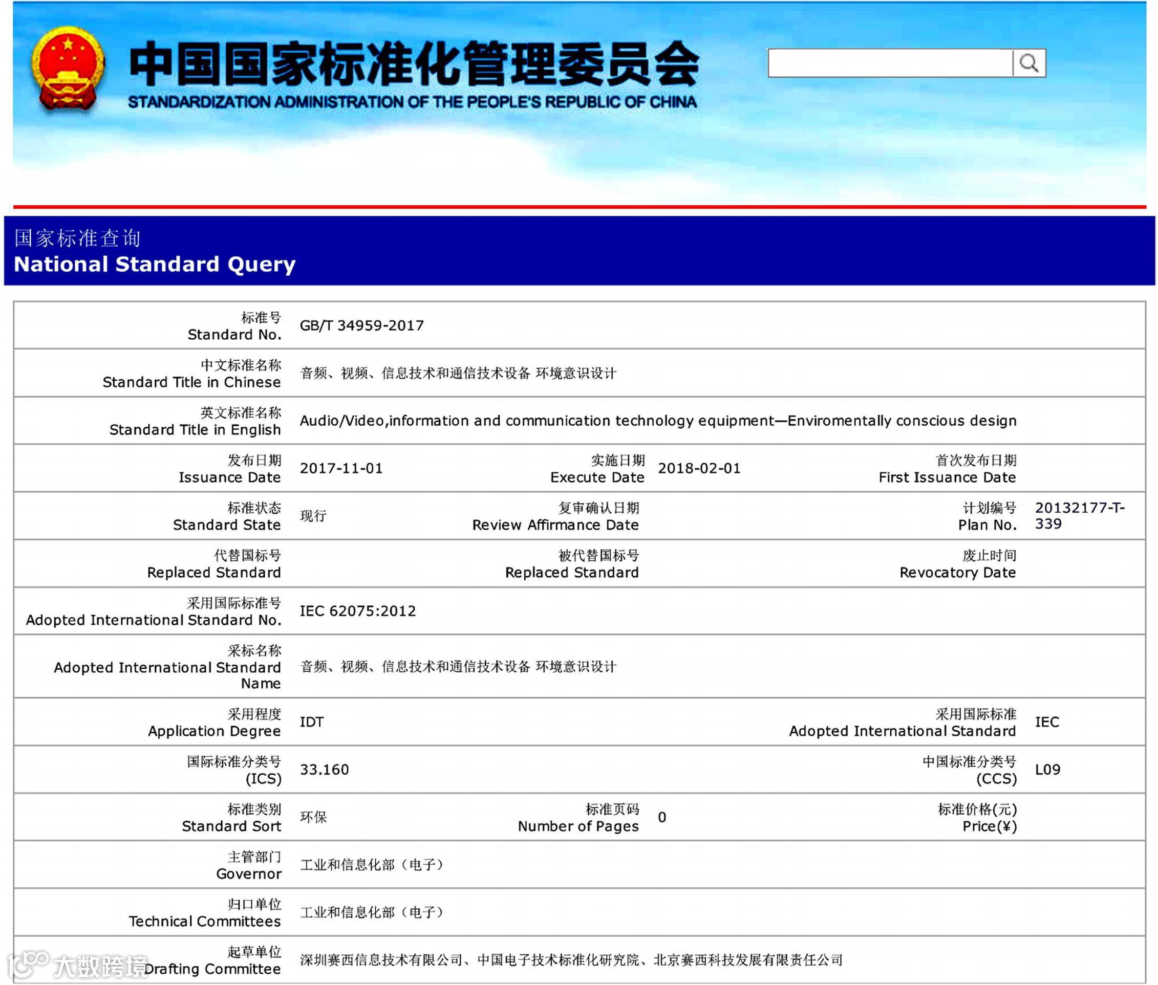 近日,国家标准化管理委员会公布了《中华人民共和国国家标准公告》(2017年第29号),由中国电子技术标准化研究院(以下简称赛西,CESI)、深圳赛西信息技术有限公司、北京赛西科技发展有限责任公司共同负责起草的标准GB/T 34959-2017《音频、视频、信息技术和通信技术设备 环境意识设计》发布。赛西安全室的何鹏林、郭佩作为起草人参与了该项标准的具体制定工作,同时参与起草的还有:林轩竹、李萌、王黎雯、陈小松等。该项标准的发布日期为2017年11月1日,具体实施日期为2018年2月1日。