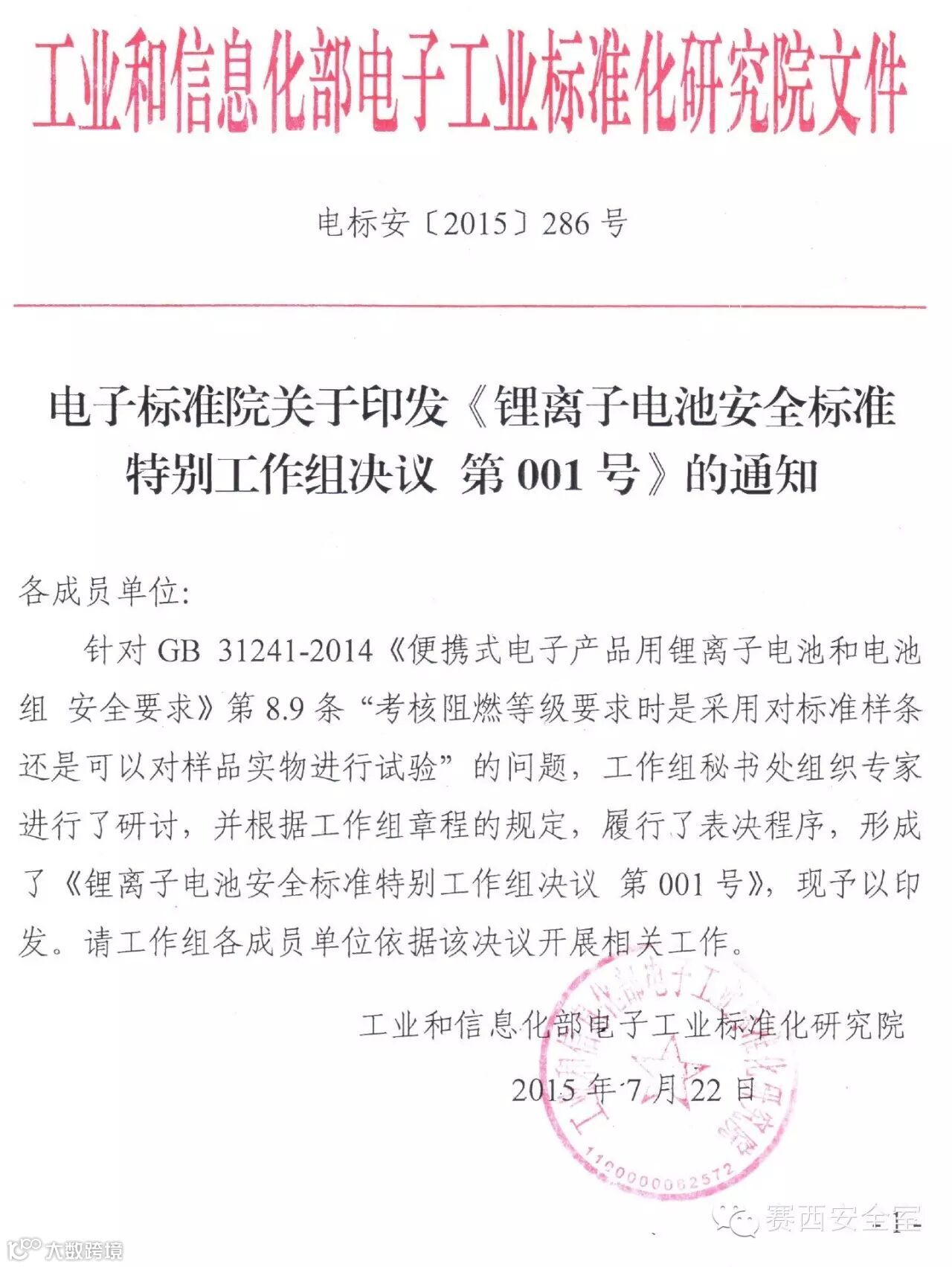 截至今日(2016年5月11日),工信部锂离子电池安全标准特别工作组共发布工作组决议2项,均与GB 31241-2014《便携式电子产品用锂离子电池和电池组 安全要求》相关,分别如下: