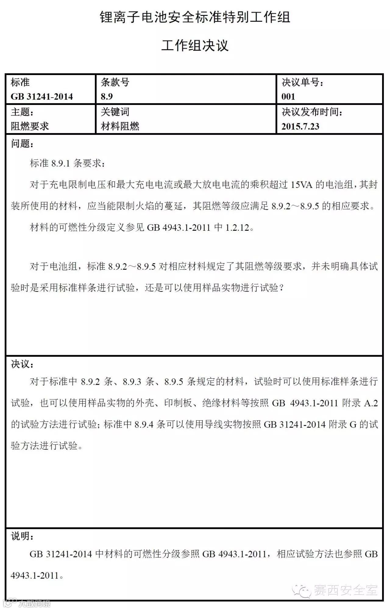 第001号决议:GB 31241-2014第8.9条“阻燃要求”
