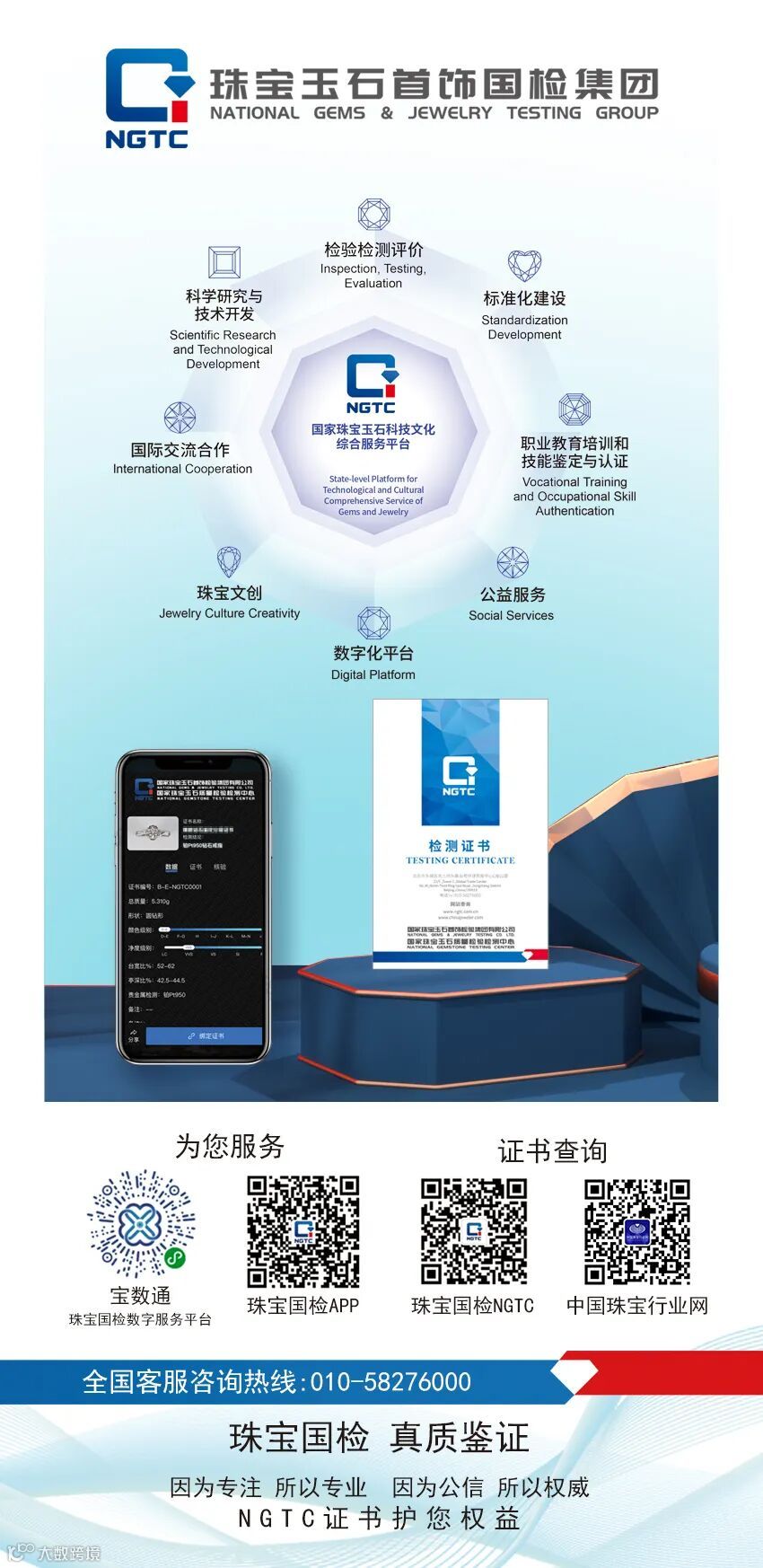 珠宝国检(NGTC)拥抱科技数字化,推出数字证书和宝数通数字服务平台,为您提供快捷便利的获取检测证书的绿色通道。