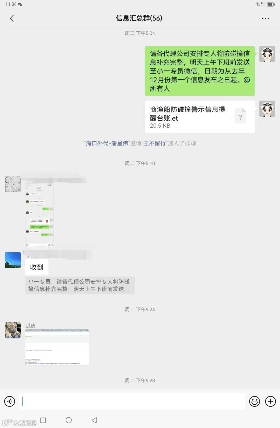 协调辖区船舶代理发挥传递桥梁作用,要求代理将商渔船防碰撞信息发送至进出港的外籍船舶,待确认外轮收到相关信息后,及时向海事报告。海事政务办理窗口系统汇总商渔船防碰撞各类警示信息与安全提醒记录,规范建立专项台账,确保相关工作可追溯、可核查。