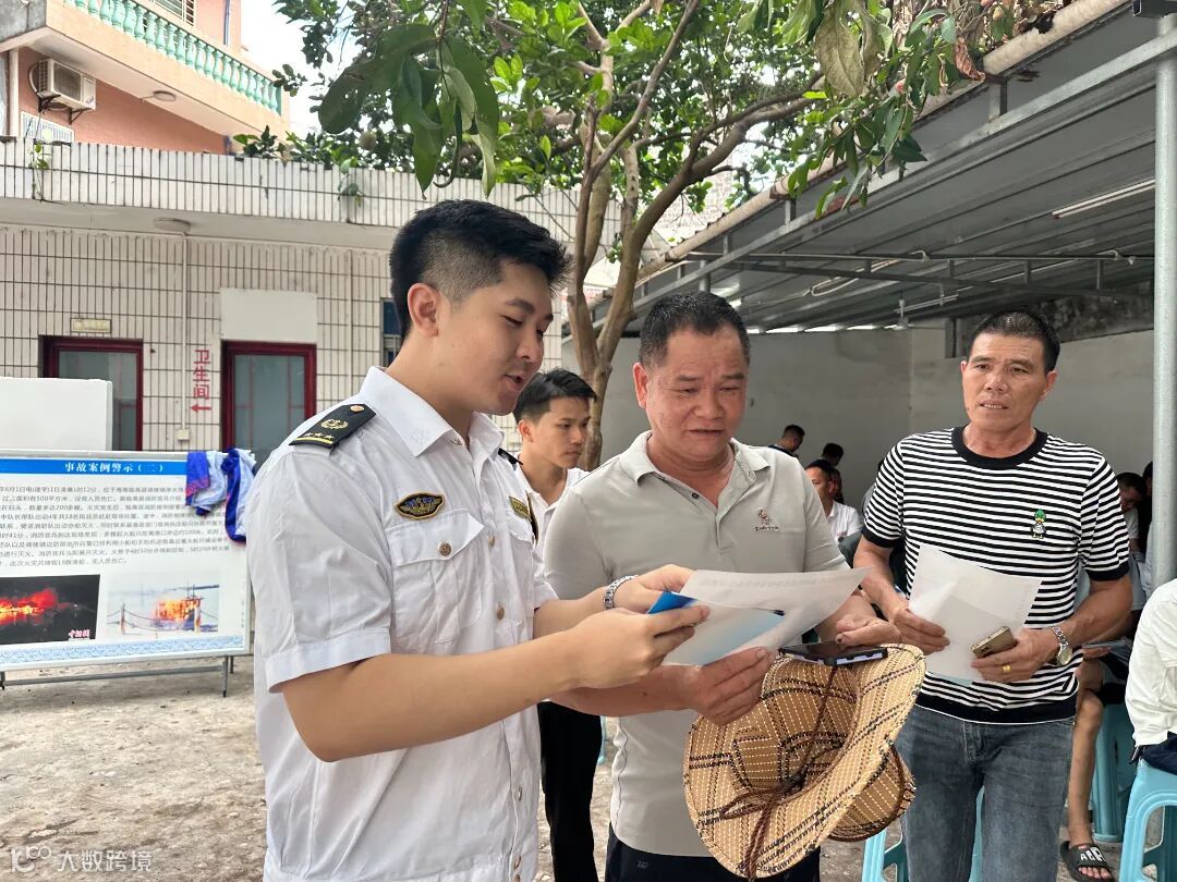 在现场,宣教人员发放防范商渔船碰撞手册(渔船版),通过海南岛西北部航路和商渔船碰撞事故多发区示意图展示,结合辖区内渔船事故特点,以案说教,分析事故原因;向现场听众科普辖区碰撞事故多发水域情况,提醒渔船驾驶人途经该水域时谨慎驾驶。讲解事故预防和应对措施等安全知识,叮嘱驾驶人务必严格遵守海上避碰规则,确保航行安全。提出防范商渔船碰撞事故安全建议,嘱咐听众务必记住海上遇险求助电话,遇险时及时求助。