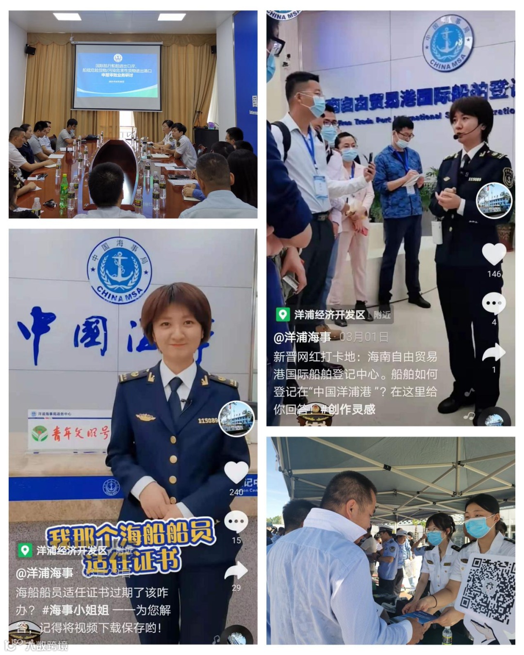 围绕辖区高频的政务服务事项,采用“线上+线下”的方式开展海事送知识活动。不定期组织辖区代理公司、航运企业召开业务研讨会,传达最新政策法规,并解答海事业务办理过程中存在的问题;利用抖音、微信公众号解答“中国洋浦港”登记、船员证书办理等公众关切的政务办理要点;结合“安全生产月咨询日”“水上安全知识进渔村”等活动宣讲海上安全知识。