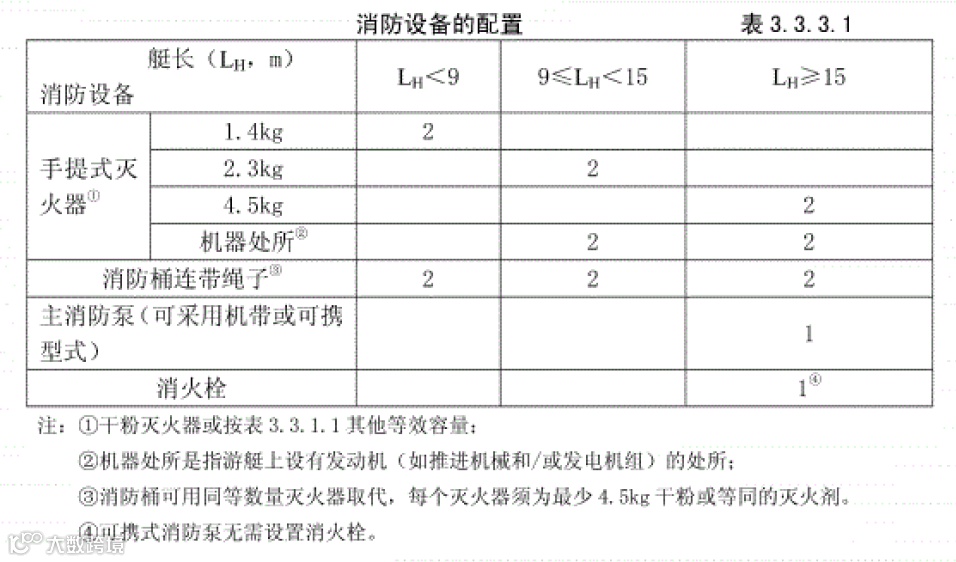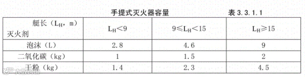 3.3.1.1 根据游艇艇长,每一类型手提式灭火器的容量不小于下面的规定: