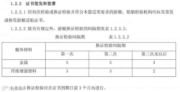 每艘游艇应按规定及时向有关船舶检验机构申请初次检验、换证检验,必要时申请附加检验,其中,申请换证检验的时间间隔要求如下: