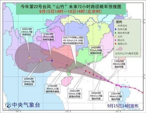 今年第22号台风“山竹”已于今天(15日)上午在菲律宾吕宋岛西北陆地减弱为强台风级,上午9点30分前后移入南海东北部,10点钟其中心位于广东阳江东偏南方950公里的海面上,就是北纬18.3度、东经120.3度,中心附近最大风力15级(48米/秒),中心最低气压945百帕,七级风圈半径380-500公里,十级风圈半径100-220公里,十二级风圈半径60-80公里。