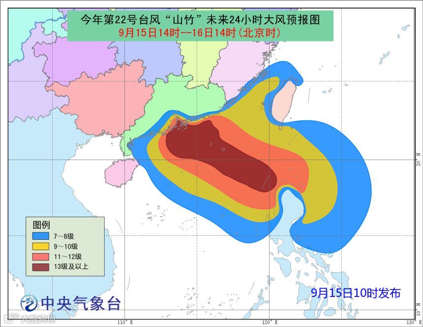 大风预报:15日14时至16日14时,南海中北部、台湾海峡、巴士海峡、台湾以东洋面、台湾岛及其沿海、福建沿海、广东南部及沿海、珠江口、香港、澳门、海南东部沿海等地和海区将有7-10级大风,阵风11-12级;其中南海中东部和北部、巴士海峡、珠江口、香港、澳门等将有11-13级大风,阵风14级,台风中心经过的附近海面风力可达14-16级,阵风17级。