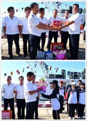 洋浦海事局向船员送上节日慰问品,一名体验代表献上了美丽的鲜花。