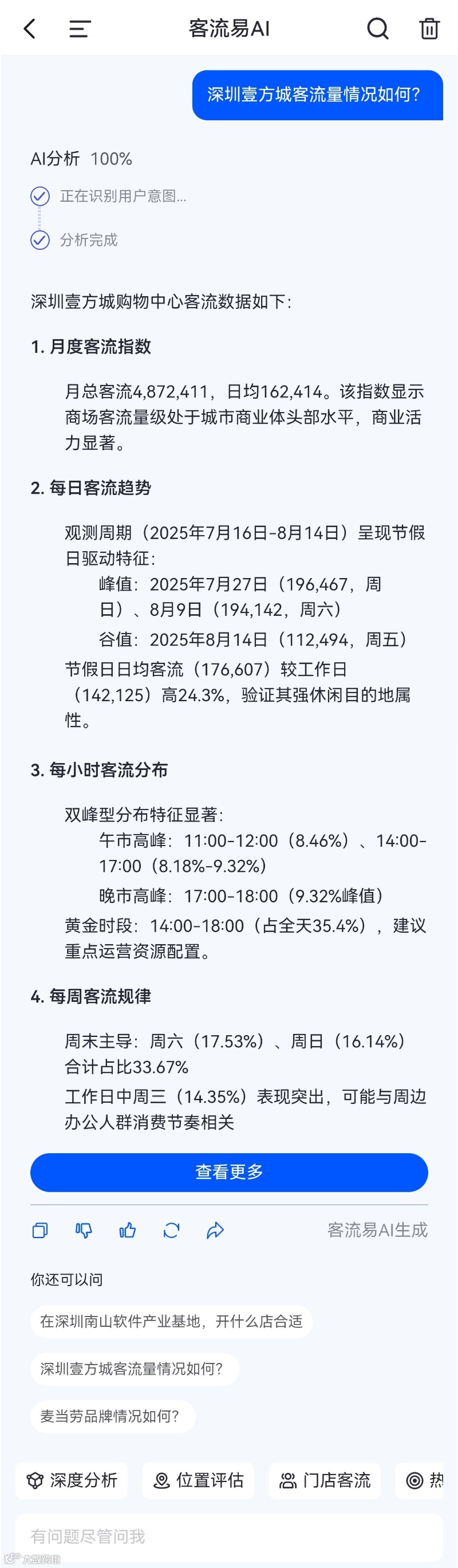 例如,您想快速了解深圳壹方城购物中心的客流概况,只需直接询问客流易AI:“深圳壹方城客流量情况如何?”