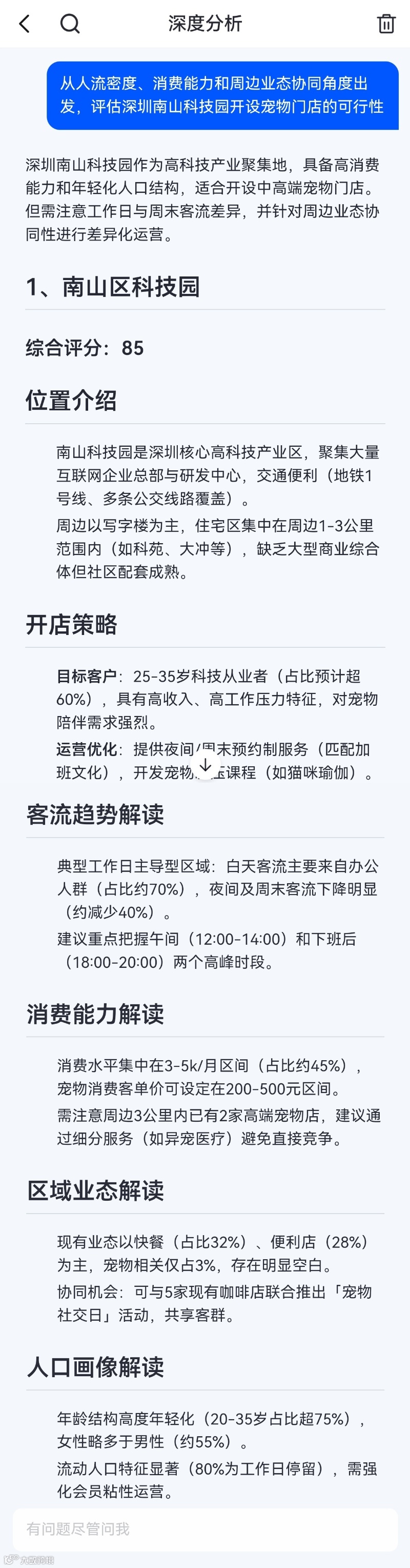 例如,您计划在深圳南山科技园区域开设一家宠物店,但不确定市场可行性。您可以提出更复杂的分析需求:“从人流密度、消费能力、周边业态协同角度出发,评估深圳南山科技园开设中高端宠物店的可行性。”