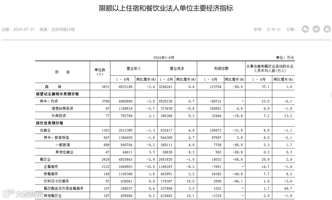 根据北京市统计局数据显示,2024上半年北京餐饮业收入下降了3.5%,利润总额更是锐减88.8%。