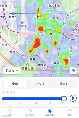 你可以用直接选择“24h热力图”,选择需要查看客流的位置,自选时间段和范围,哪里人多客流量大,大数据热力图便能快速告诉你答案。