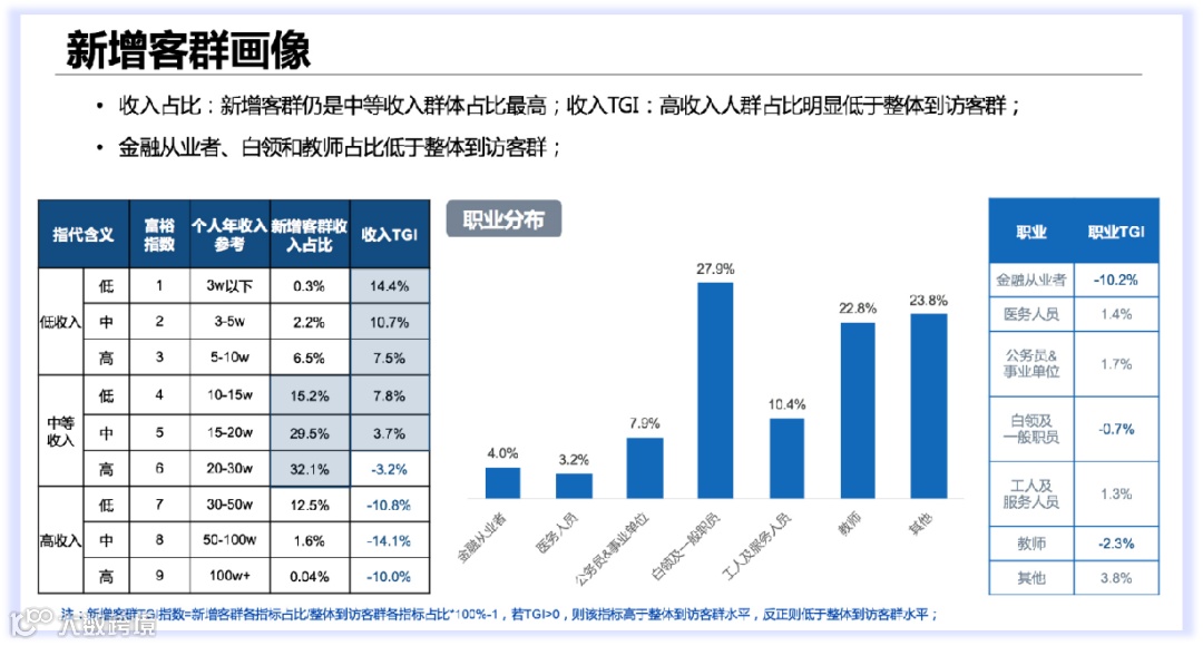 新增客群与流失客群:根据客群不同时段的到访,统计客群的新增率与流失率,同时研究客群场内外的品牌到访表现,探索项目的优化调整方向;