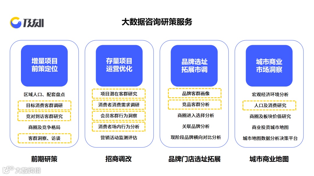 客群研究可以贯穿线下商业各个业务场景,为商业地产、零售品牌等行业在前策定位、运营优化、品牌选址、城市商业调研等环节提供重要支撑,是及刻咨询服务方案的重要组成部分。