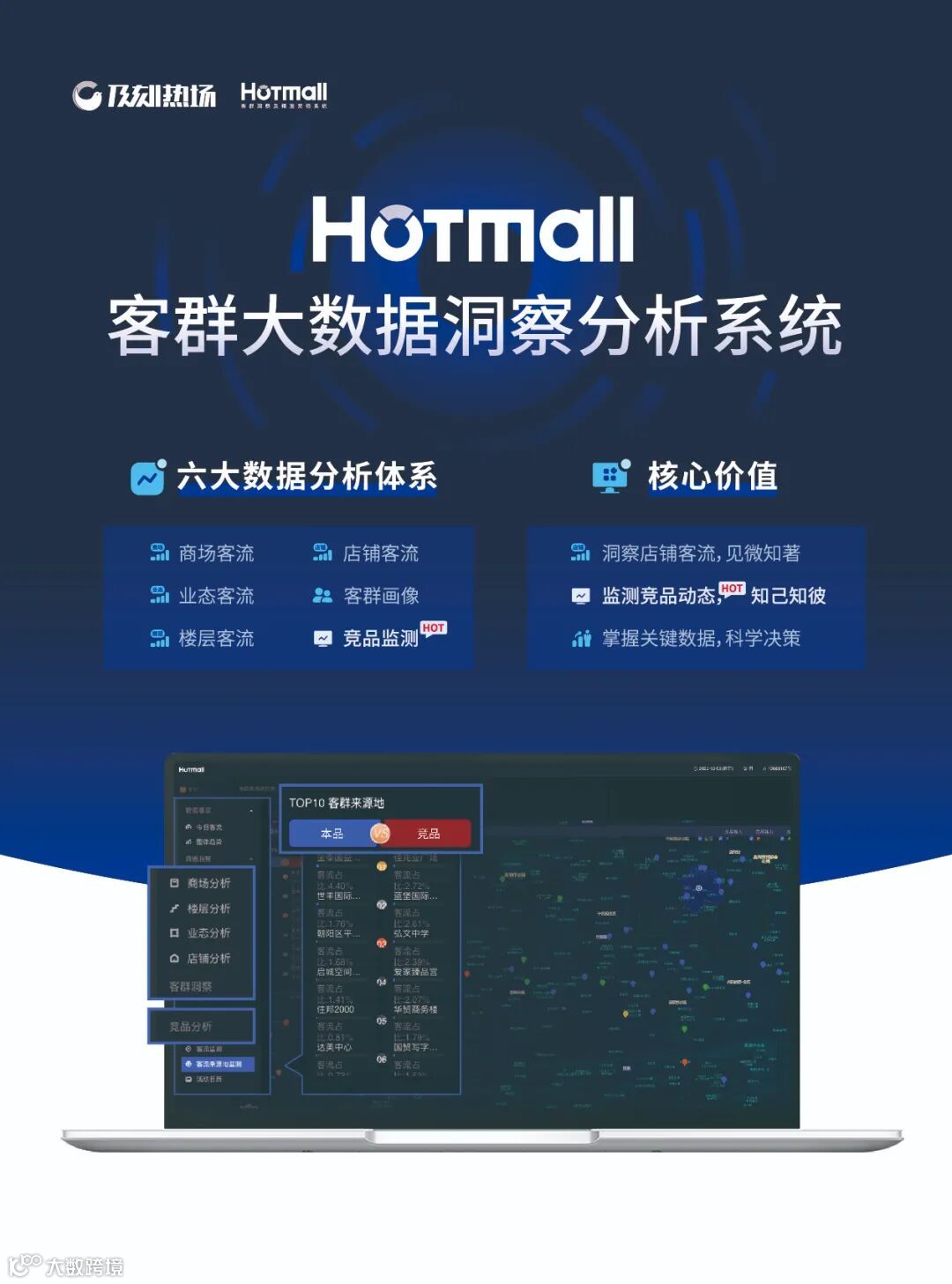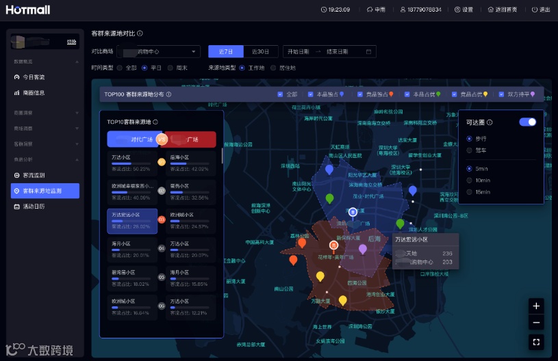 针对购物中心最核心、最迫切的需求,及刻热场几经打磨,推出HOTMALL客群大数据洞察分析系统,可对商业项目的客群情况进行全方位的洞察、分析及可视化呈现。