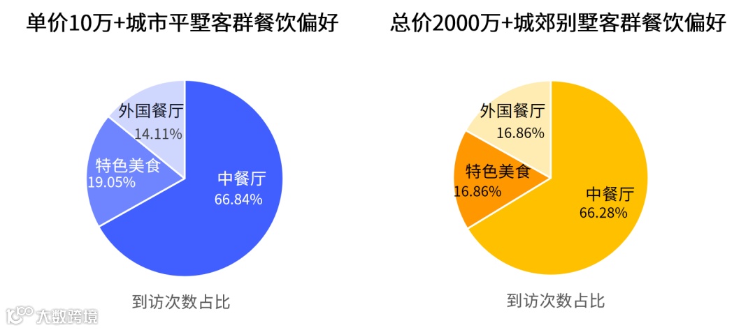 从餐饮的角度看,单价10万+城市平墅客群和总价2000万+城郊别墅客群对中餐厅的偏爱度最高且占比也基本相同,但是城市平墅客群更多喜欢新奇的特色美食,城郊别墅客群更多偏好有情调的外国餐厅。那喜欢新奇和情调的高端客群到底喜欢吃什么?