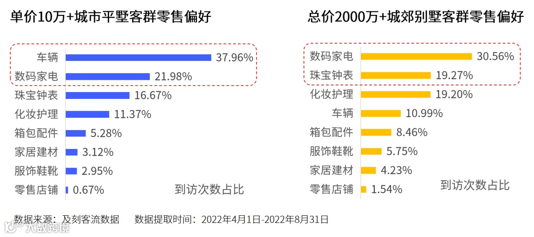 高端豪宅客群平时都爱买什么?从零售的角度来看,单价10万+城市平墅客群更喜欢玩豪车,而总价2000万+城郊别墅客群则相对低调内敛,更喜欢数码家电和珠宝钟表。