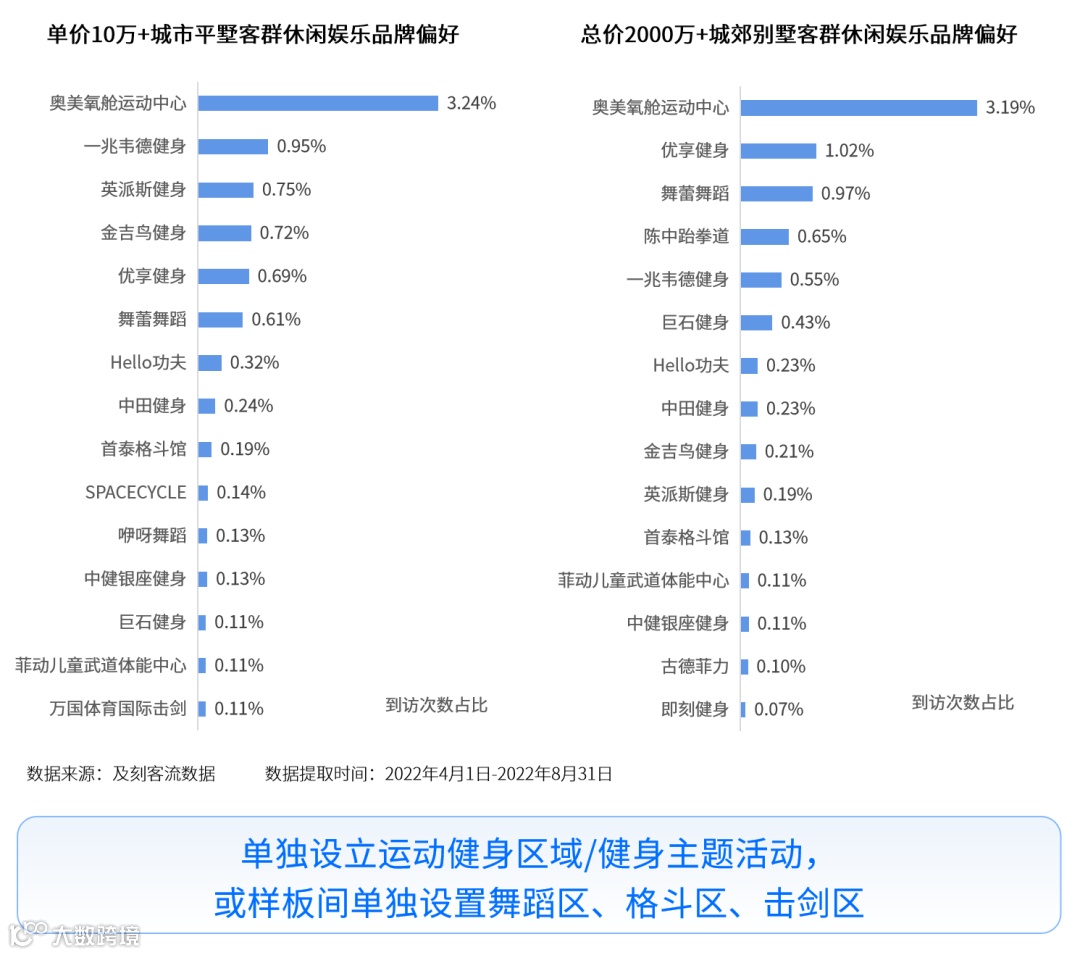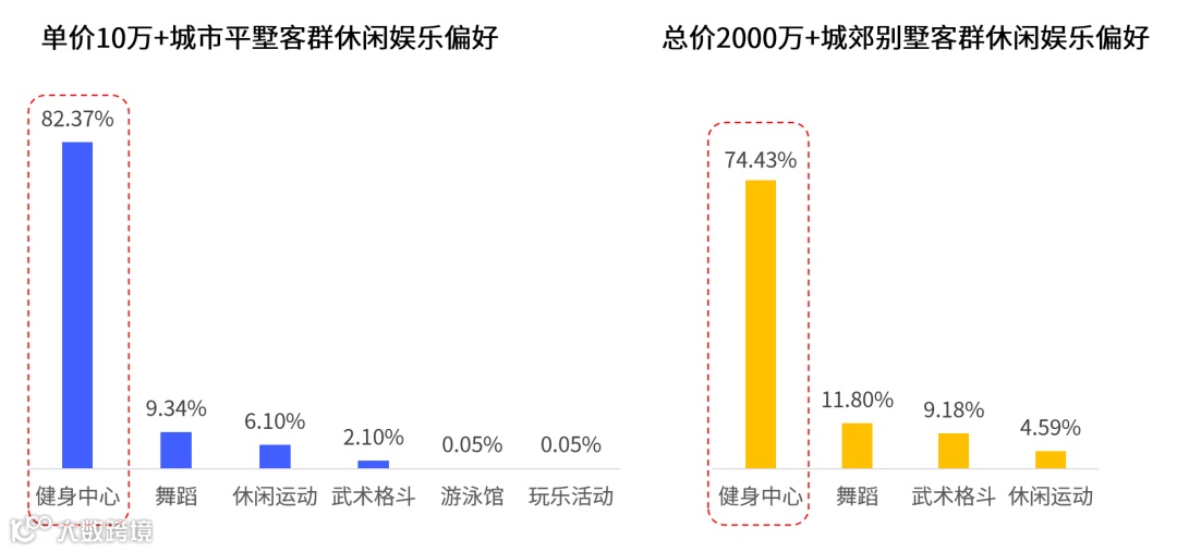 豪宅客群休闲娱乐偏好没有电影、电视剧里喧闹的酒吧,更没有夜夜笙箫的娱乐会所。取而代之的是健身中心、舞蹈、休闲运动、武术格斗等,尤其是健身中心,总价2000万+城郊客群去健身中心次数占比接近75%,单价10万+城市平墅客群去健身中心次数占比超过80%。