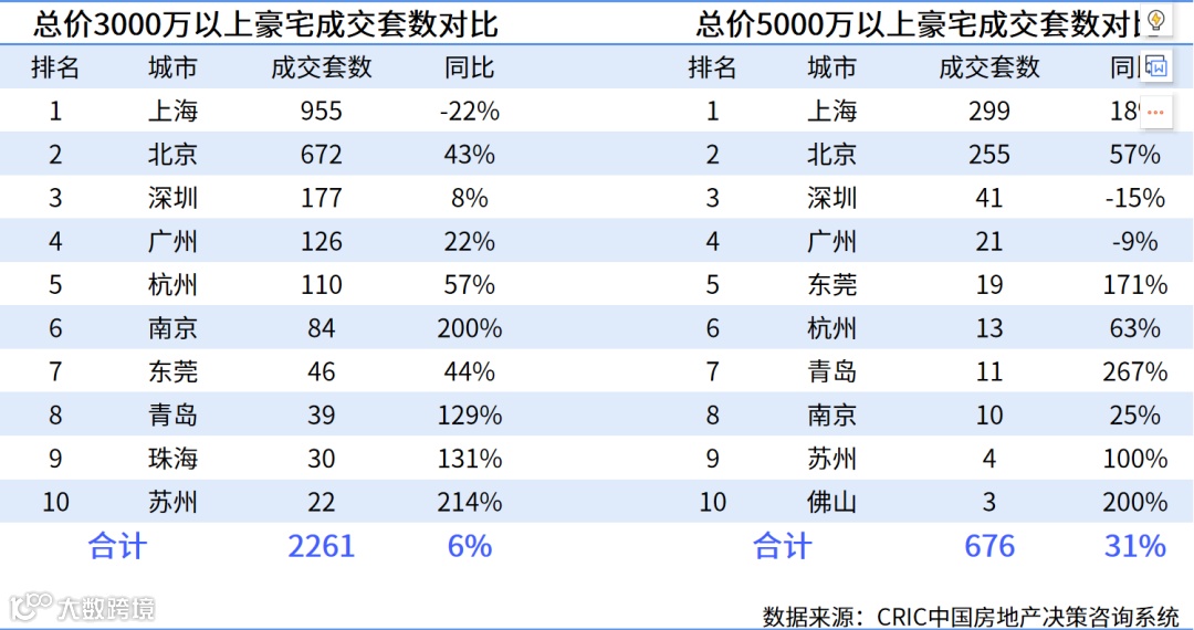 上海、北京依然是顶豪聚集地,总价3000万元以上和5000万元以上豪宅成交总量分别增长6%和31%。