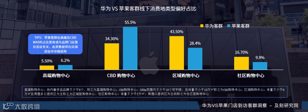 华为客群消费爱在就近,方便为主;苹果客群消费爱在市中,远点也行