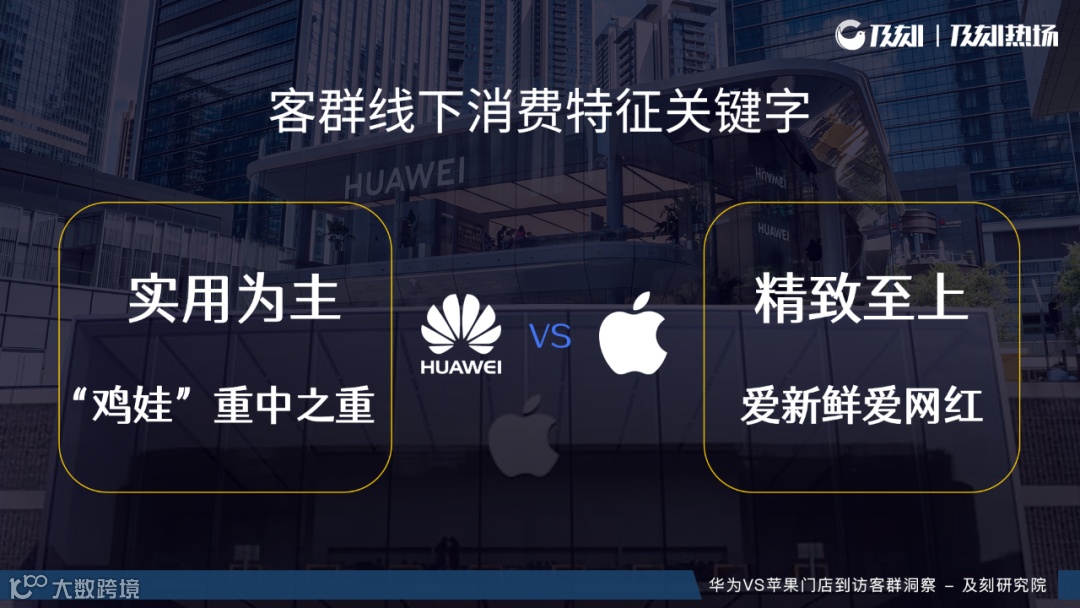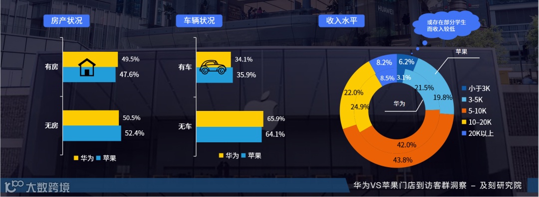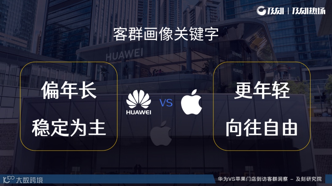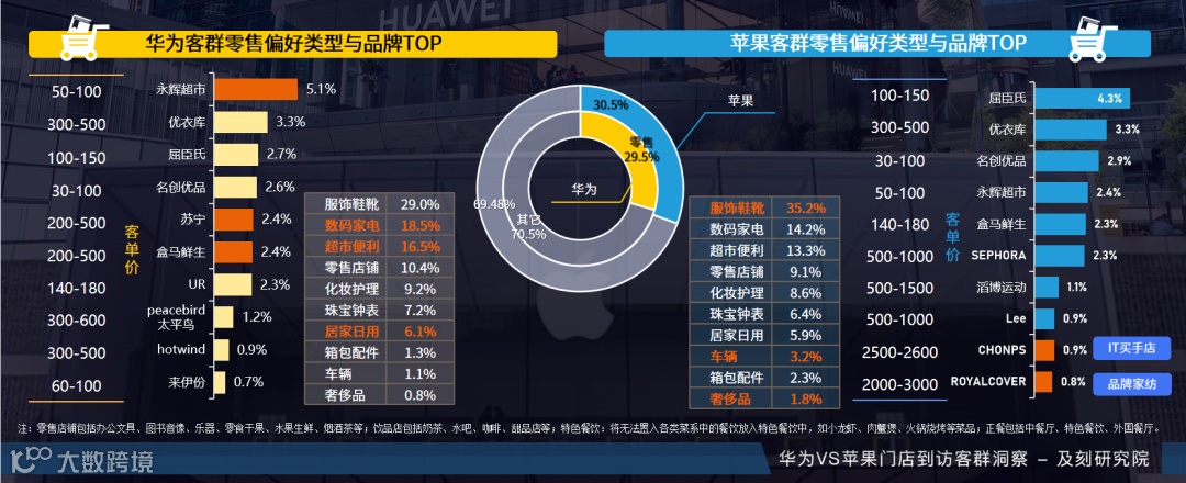 及刻研究院以北上广深四个城市的华为、苹果各200家门店近半年内的到访客群为样本,对两类门店客群特征进行研究。