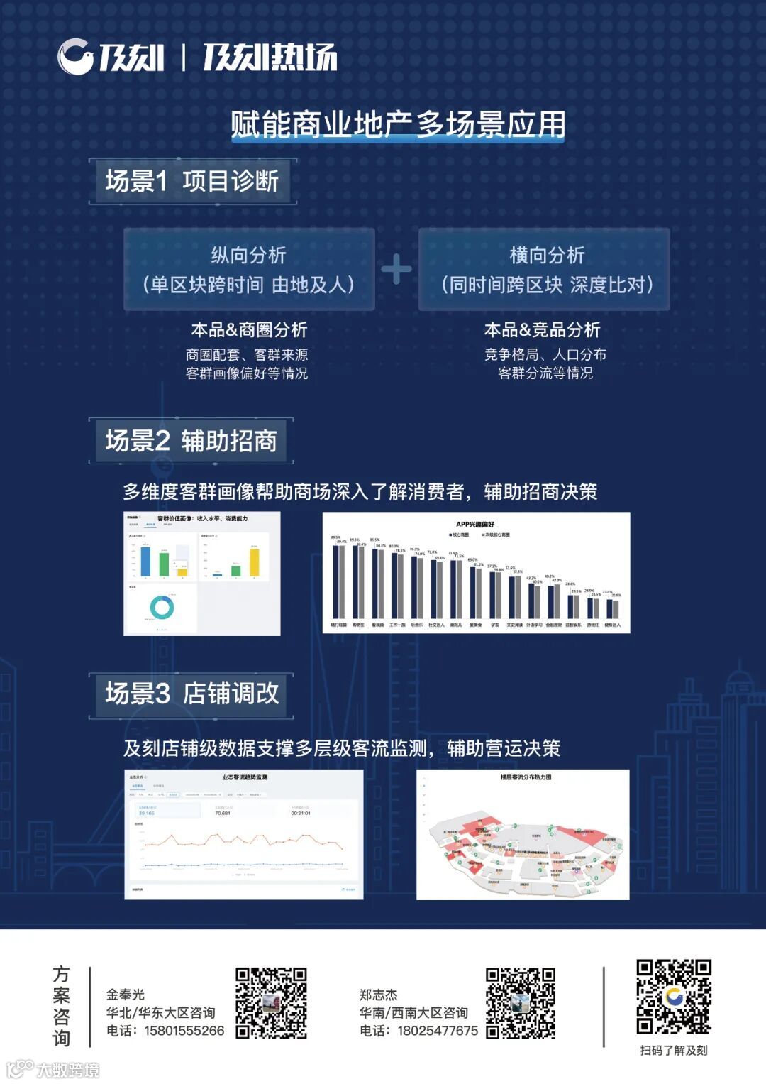 12月16日,及刻将在现场与大家交流商业数智化新玩法,探索新趋势。本次及刻将带来新升级攻略——及刻热场商业地产数字化服务解决方案,通过专为商业地产行业打造的三大产品服务,助力商场有效营销引流,优化决策制定。