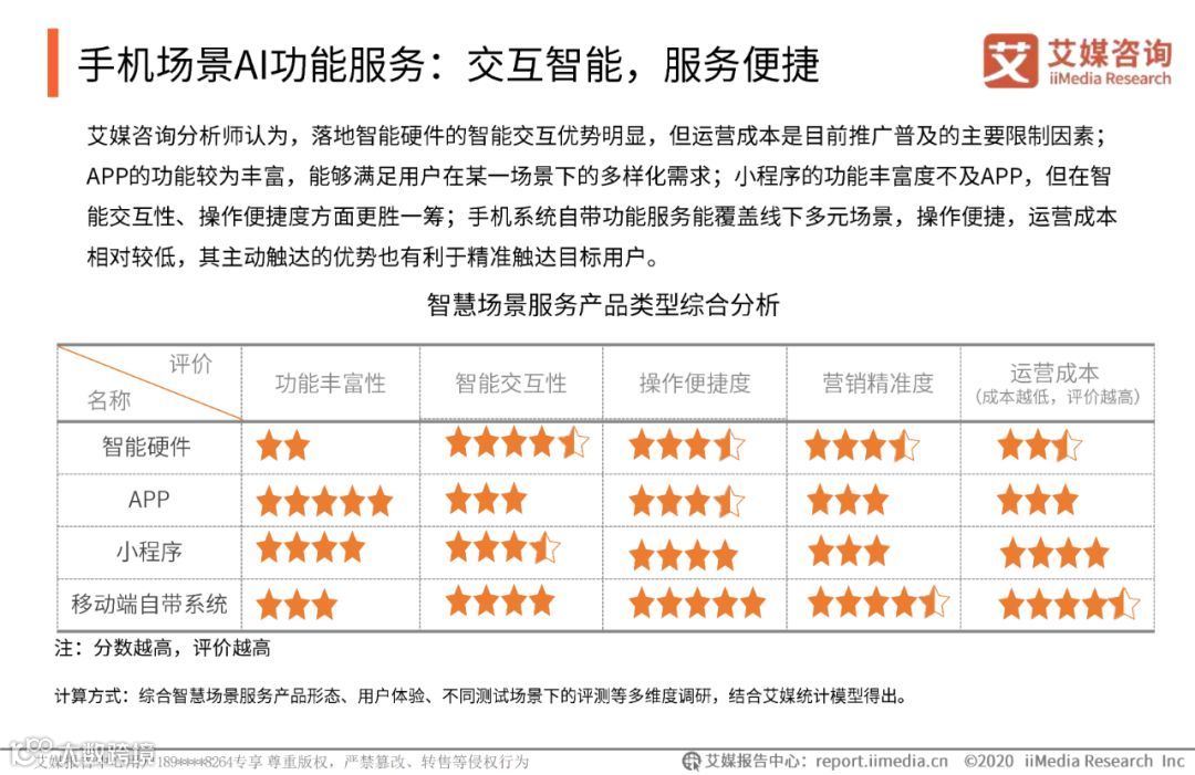 报告对目前市场上的几类智慧场景服务产品进行归纳,包括:智能硬件、APP、小程序和手机场景AI功能服务。各类方案各有优劣,在场景落地时呈现协同发展态势。其中,手机场景AI功能服务,凭借交互、触达等方面的优势,应用潜力巨大。