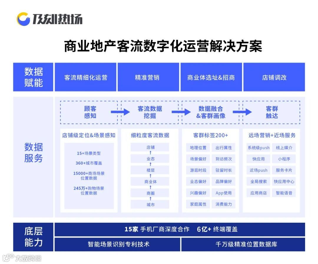 及刻热场便是紧贴商业地产数字化运营的紧迫需求而生,依托及刻线下大数据处理能力,及刻热场灵活运用「知、通、达」三步法则,帮助购物中心打通顾客感知、数据挖掘、客群洞察、精准触达的客流数字化运营闭环,驱动客流运营更加精细化,全面提升运营效能。