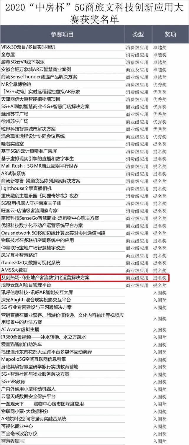 由中国房地产业协会、上海市经济和信息化委员会联合指导,中国房协商业文化旅游地产委员会、上海5G产业促进中心共同主办的首届“中房杯”5G商旅文科技创新应用大赛,近日公布获奖名单。「及刻热场」经历层层选拔及评审,从近200个项目中脱颖而出,荣获“商业级应用提名奖”。