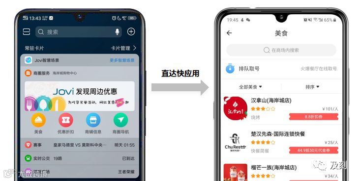 由及刻与手机品牌共同打造的手机负一屏智慧场景卡片,成为线下场景快应用重要的系统级入口,服务前置,一步直达。