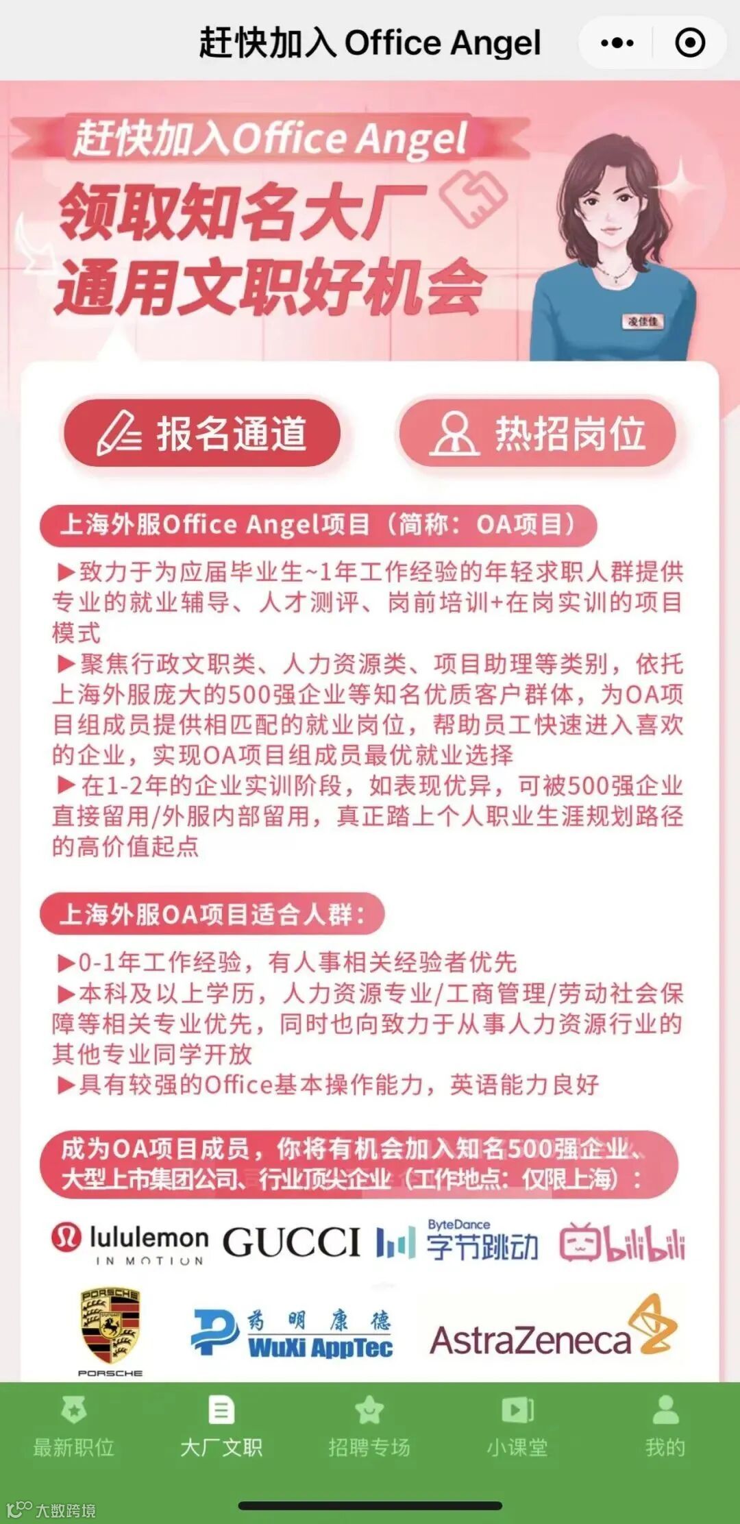 3月下旬开始,疫情急转直下,上海外服逆势而上,结合自身业务特点,依托庞大的世界500强等知名客户企业群体,以致力于助力毕业生担任办公室白领文职人员的“Office Angel校招项目”(以下简称OA校招项目)作为主要突破口,每周发布行政文职、人事管理、项目助理等岗位, 并在一站式小程序“凌佳佳职场帮”上特别开设“大厂文职”专区和专属通道,助力2022届大学毕业生就业。