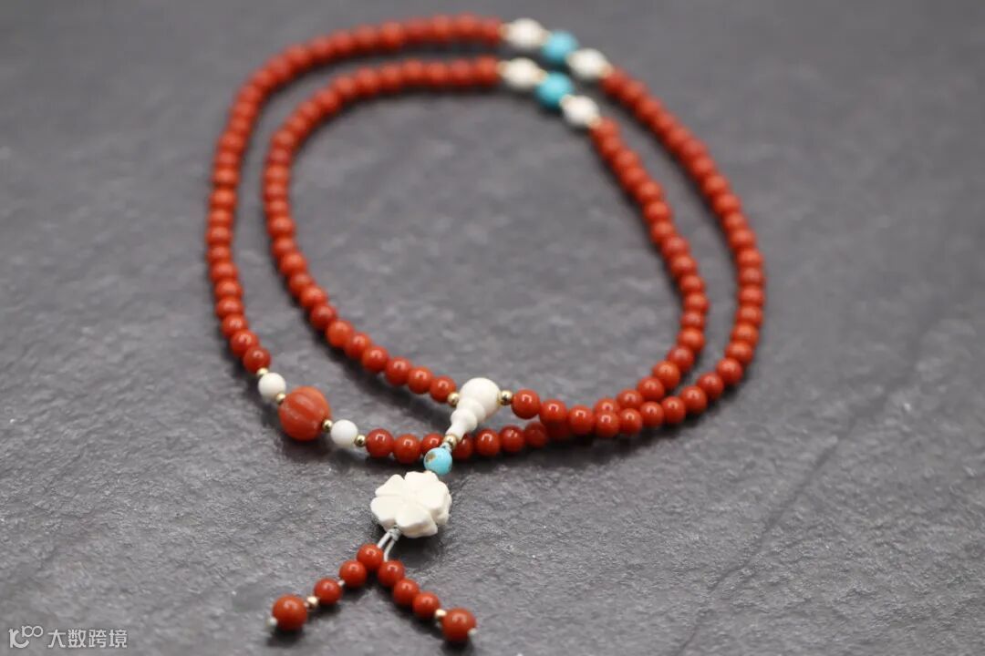一串串南红圆珠,红润饱满,灵动剔透,搭配装饰,吉祥如意,也更加衬托出南红的鲜亮色泽。