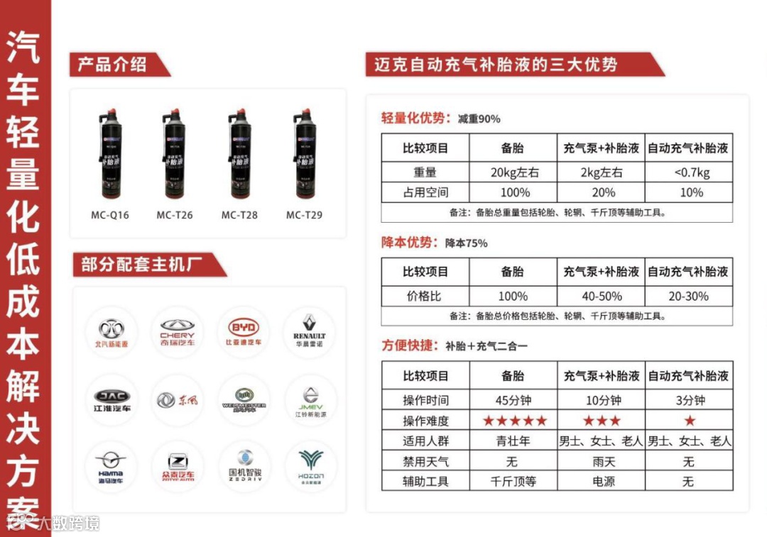 我司的“迈克自动充气补胎液”产品凭借降本减重的突出优势,成功在汽车轻量化产品中脱颖而出,成为各大汽车主机厂广泛应用的产品。