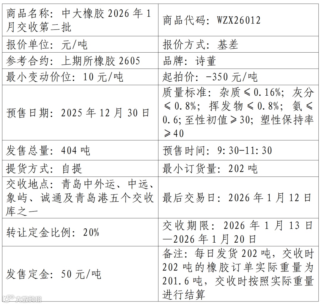 物产中大资本管理(浙江)有限公司定于2025年12月30日在产能预售系统中发售2026年1月交收第二批橡胶产品,具体信息如下: